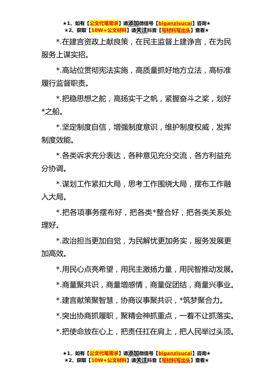 ★1、如有【公文代笔需求】请添加微信号【biganzisucai】咨询★★2、获取【10W+公文材料】请关注抖音【写材料写出头】查看★人大政协工作类排比句*例(**年**)1.充分发挥优势,当好服务大局“智囊团”;全力惠企暖企,当好民营经济“贴心人”;切实凝聚合力,当好和谐共进“连心桥”。2.**把好“方向舵”,群策群力当好“智囊团”,用情用力架好“连心桥”,尽职尽责练好“基本功”。3.展现了讲政治、顾大局的新担当,彰显了善创新、树品牌的新作为,谱写了凝共识、聚合力的新篇章。4.*同向、同频共振的政治态度,围绕中心、服务大局的责任意识,依法履职、参政议政的能力水平。5.找准“公约数”,画好“*圆”;建好“智囊团”,争做“生力军”;筑牢“防火墙”,当好“稳定器”。6.协商主业走深走实,服务中心用...