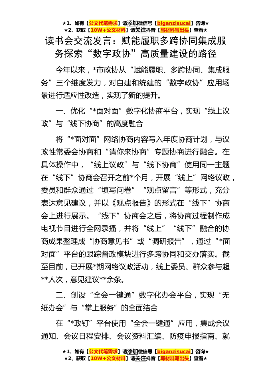 ★1、如有【公文代笔需求】请添加微信号【biganzisucai】咨询★★2、获取【10W+公文材料】请关注抖音【写材料写出头】查看★★1、如有【公文代笔需求】请添加微信号【biganzisucai】咨询★★2、获取【10W+公文材料】请关注抖音【写材料写出头】查看★★1、如有【公文代笔需求】请添加微信号【biganzisucai】咨询★★2、获取【10W+公文材料】请关注抖音【写材料写出头】查看★读书会交流发言:赋能履职多跨协同集成服务探索“数字政协”高质量建设的路径今年以来,*市政协从“赋能履职、多跨协同、集成服务”三个维度发力,对自建和统建的“数字政协”应用场景进行适应性改造,实现了新的提升。一、优化“*面对面”数字化协商平台,实现“线上议政”与“线下协商”的高度融合将“*面对面”网络协商内容写入年度协商...