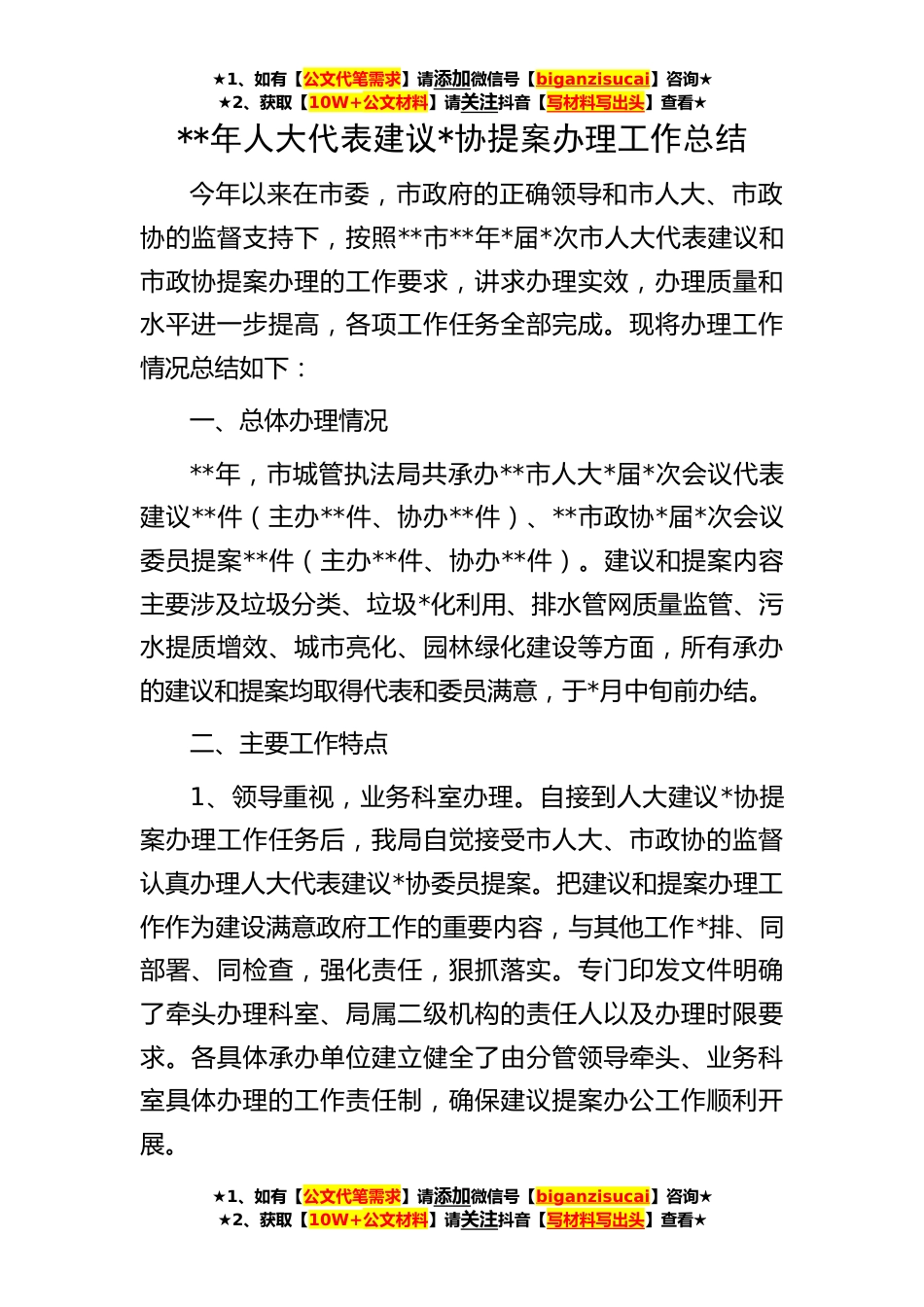 ★1、如有【公文代笔需求】请添加微信号【biganzisucai】咨询★★2、获取【10W+公文材料】请关注抖音【写材料写出头】查看★★1、如有【公文代笔需求】请添加微信号【biganzisucai】咨询★★2、获取【10W+公文材料】请关注抖音【写材料写出头】查看★★1、如有【公文代笔需求】请添加微信号【biganzisucai】咨询★★2、获取【10W+公文材料】请关注抖音【写材料写出头】查看★**年人大代表建议*协提案办理工作总结今年以来在市委,市政府的正确领导和市人大、市政协的监督支持下,按照**市**年*届*次市人大代表建议和市政协提案办理的工作要求,讲求办理实效,办理质量和水平进一步提高,各项工作任务全部完成。现将办理工作情况总结如下:一、总体办理情况**年,市城管执法局共承办**市人大*届*次会议代表建议**件...