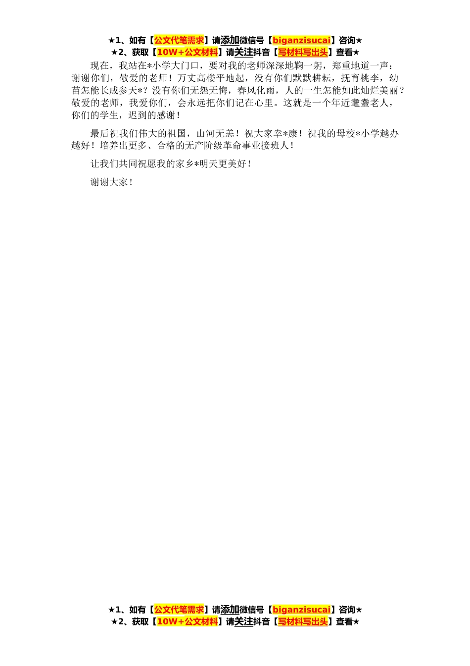 ★1、如有【公文代笔需求】请添加微信号【biganzisucai】咨询★★2、获取【10W+公文材料】请关注抖音【写材料写出头】查看★尊敬的各位领导、各位老师、各位同学、各位*:大家上午好!首先,我代表**经济文化研究会、并以*小学老校友的名义,向*县实验小学增设*小学校名揭牌仪式表示热烈祝贺!今天我应邀参加*县实验小学增设*小学校名揭牌仪式,作为当年一名*小学老校友,我感到特别激动,感觉有千言万语的话要说,因为时间关系,我只能用“感动、感慨、感恩、感谢”四个词来表达我此时此刻的内心感受:无比的感动生发出无限感慨,我以感恩之心,表达我的感谢之情。自从**,我的一封“关于要求将*县实验小学恢复为*小学的建议”给中共*县委、县政府领导的信在网上发表,立刻得到来自全国各地网友的热烈呼应,短短...