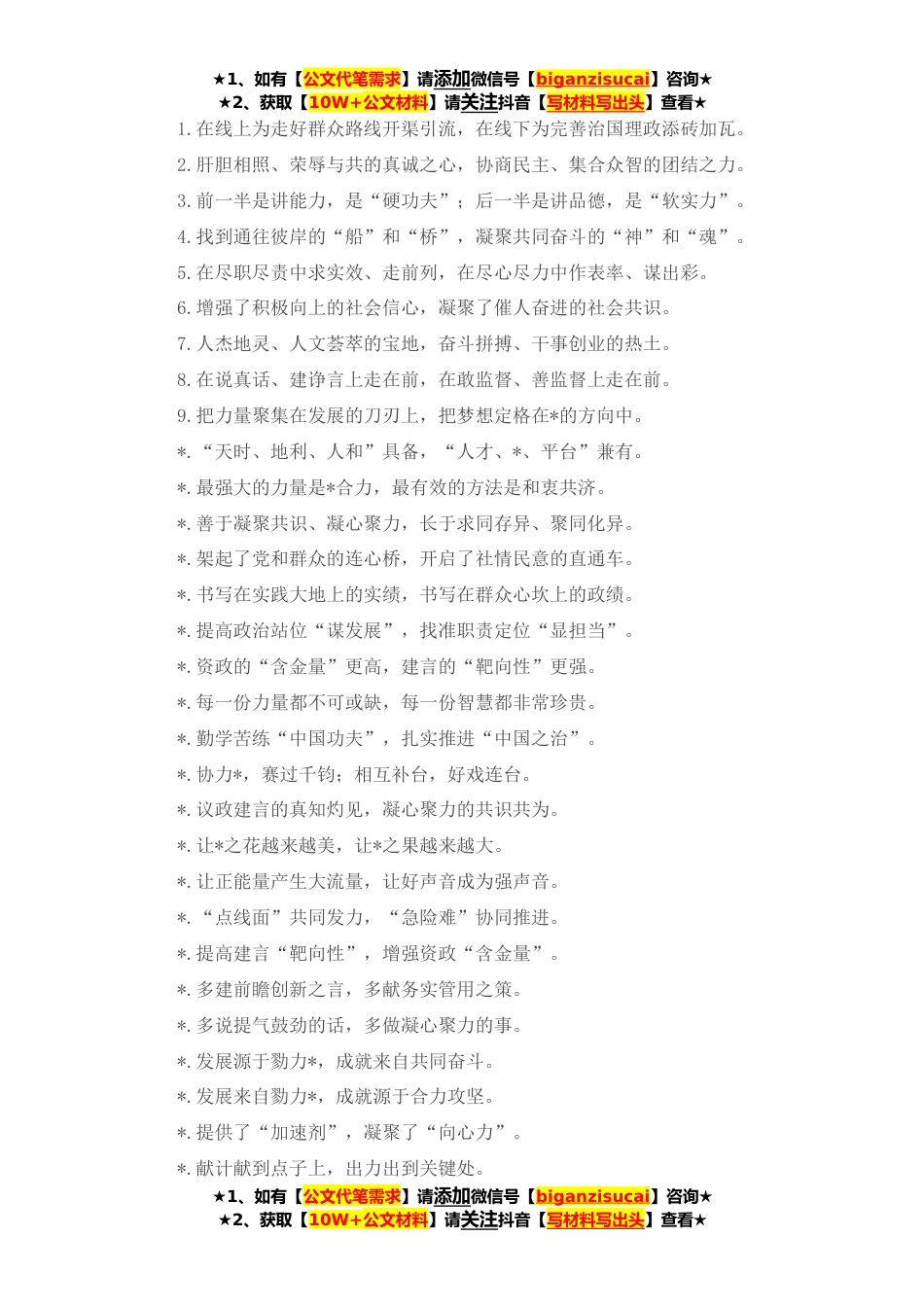★1、如有【公文代笔需求】请添加微信号【biganzisucai】咨询★★2、获取【10W+公文材料】请关注抖音【写材料写出头】查看★1.在线上为走好群众路线开渠引流,在线下为完善治国理政添砖加瓦。2.肝胆相照、荣辱与共的真诚之心,协商民主、集合众智的团结之力。3.前一半是讲能力,是“硬功夫”;后一半是讲品德,是“软实力”。4.找到通往彼岸的“船”和“桥”,凝聚共同奋斗的“神”和“魂”。5.在尽职尽责中求实效、走前列,在尽心尽力中作表率、谋出彩。6.增强了积极向上的社会信心,凝聚了催人奋进的社会共识。7.人杰地灵、人文荟萃的宝地,奋斗拼搏、干事创业的热土。8.在说真话、建诤言上走在前,在敢监督、善监督上走在前。9.把力量聚集在发展的刀刃上,把梦想定格在*的方向中。*.“天时、地利、人和”具备,...