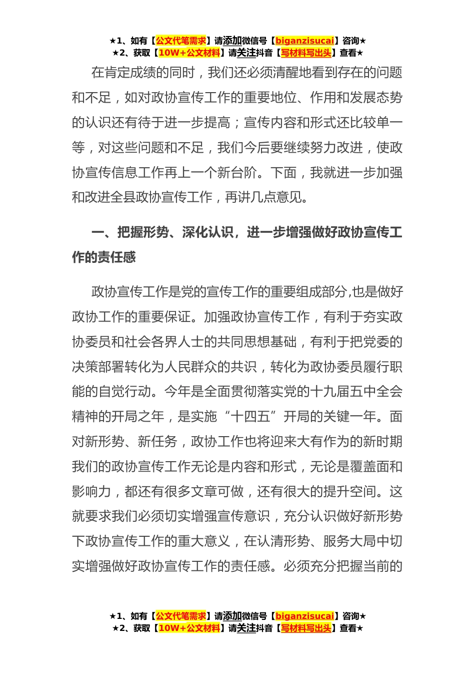 ★1、如有【公文代笔需求】请添加微信号【biganzisucai】咨询★★2、获取【10W+公文材料】请关注抖音【写材料写出头】查看★在县政协宣传信息工作会议上的讲话同志们:今天,我们在这里召开全县政协宣传信息工作会议,主要是总结交流我县政协宣传工作的经验,研究进一步加强政协宣传工作的思路和措施。刚才,几位同志围绕进一步做好政协宣传工作,从不同角度作了很好的发言,提出了很多真知灼见。这次会议虽然时间虽短,但主题明确,重点突出,开得很*,必将对推动我县政协宣传信息工作产生积极作用。**年,在县委的正确领导下,全县政协宣传工作取得了长足发展。县委宣传部坚持把政协宣传工作放在党的宣传工作全局中谋划思考,通盘考虑,统一安排,切实加强领导和指导,有力营造了推进政协宣传工作的浓厚氛围。县...