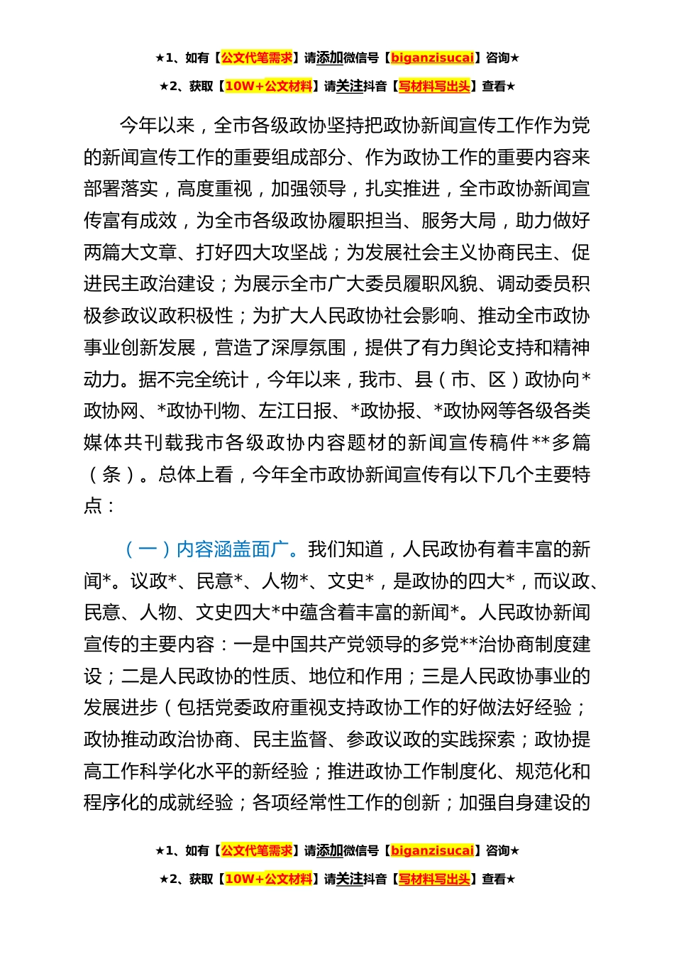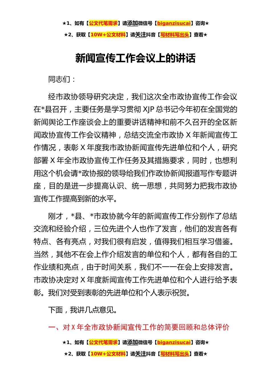 ★1、如有【公文代笔需求】请添加微信号【biganzisucai】咨询★★2、获取【10W+公文材料】请关注抖音【写材料写出头】查看★新闻宣传工作会议上的讲话同志们:经市政协领导研究决定,我们这次全市政协宣传工作会议在*县召开,主要任务是学习贯彻XJP总书记今年初在全国党的新闻舆论工作座谈会上的重要讲话精神和前不久召开的全区新闻政协宣传工作会议精神,总结交流全市政协X年新闻宣传工作情况,表彰X年度我市政协新闻宣传先进单位和个人,研究部署X年全市政协宣传工作任务及其措施要求,同时,也想利用这个机会请*政协报的领导给我们作政协新闻报道写作专题讲座,目的是进一步提高认识、统一思想,共同努力把我市政协宣传工作提高到新的水平。刚才,*县、*市政协就今年的新闻宣传工作分别作了总结交流和经验介绍...