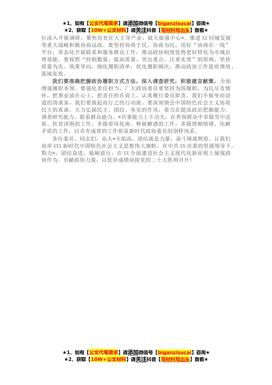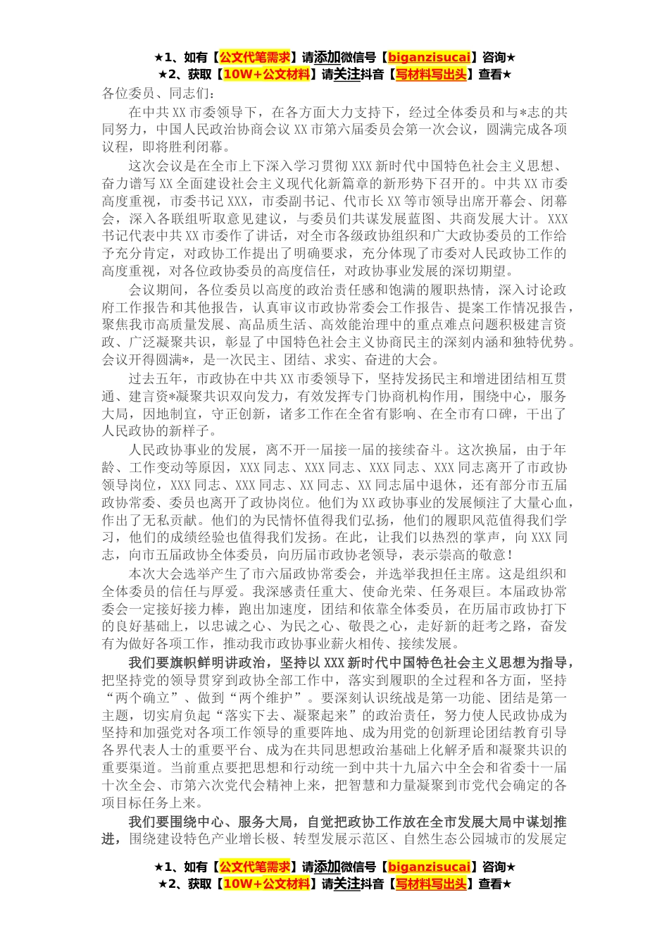 ★1、如有【公文代笔需求】请添加微信号【biganzisucai】咨询★★2、获取【10W+公文材料】请关注抖音【写材料写出头】查看★各位委员、同志们:在中共XX市委领导下,在各方面大力支持下,经过全体委员和与*志的共同努力,中国人民政治协商会议XX市第六届委员会第一次会议,圆满完成各项议程,即将胜利闭幕。这次会议是在全市上下深入学习贯彻XXX新时代中国特色社会主义思想、奋力谱写XX全面建设社会主义现代化新篇章的新形势下召开的。中共XX市委高度重视,市委书记XXX,市委副书记、代市长XX等市领导出席开幕会、闭幕会,深入各联组听取意见建议,与委员们共谋发展蓝图、共商发展大计。XXX书记代表中共XX市委作了讲话,对全市各级政协组织和广大政协委员的工作给予充分肯定,对政协工作提出了明确要求,充分体现...