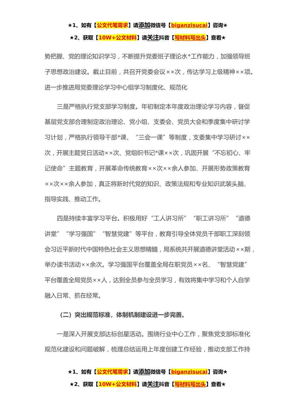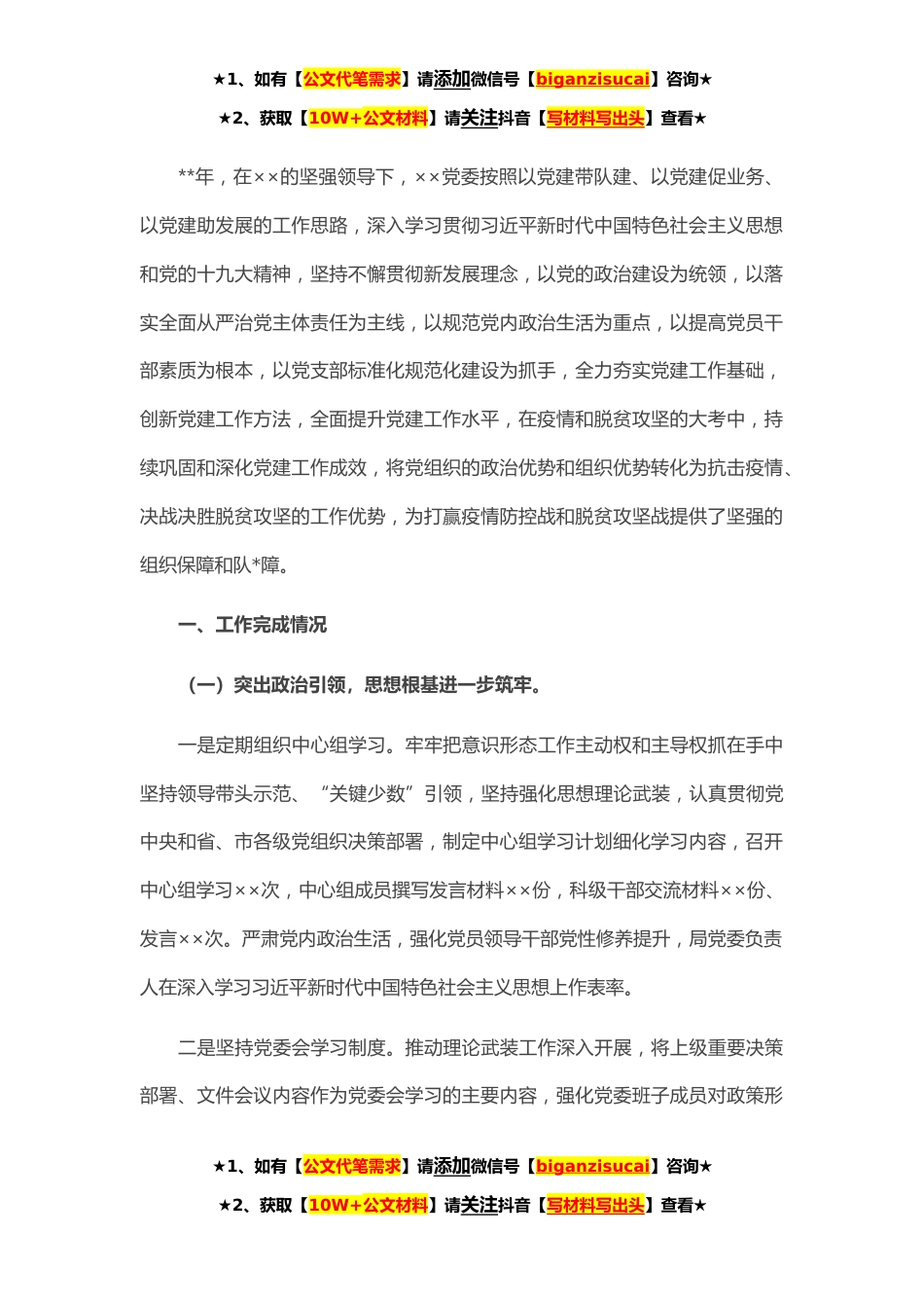 ★1、如有【公文代笔需求】请添加微信号【biganzisucai】咨询★★2、获取【10W+公文材料】请关注抖音【写材料写出头】查看★**年,在××的坚强领导下,××党委按照以党建带队建、以党建促业务、以党建助发展的工作思路,深入学习贯彻习近平新时代中国特色社会主义思想和党的十九大精神,坚持不懈贯彻新发展理念,以党的政治建设为统领,以落实全面从严治党主体责任为主线,以规范党内政治生活为重点,以提高党员干部素质为根本,以党支部标准化规范化建设为抓手,全力夯实党建工作基础,创新党建工作方法,全面提升党建工作水平,在疫情和脱贫攻坚的大考中,持续巩固和深化党建工作成效,将党组织的政治优势和组织优势转化为抗击疫情、决战决胜脱贫攻坚的工作优势,为打赢疫情防控战和脱贫攻坚战提供了坚强的组...