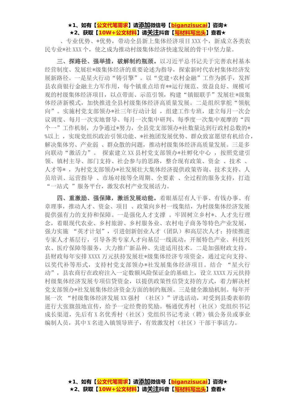 ★1、如有【公文代笔需求】请添加微信号【biganzisucai】咨询★★2、获取【10W+公文材料】请关注抖音【写材料写出头】查看★近年来,XX省XX县深入贯彻落实习近平总书记关于发展壮*级集体经济助推乡村全面*的重要指示精神,聚力提升村级党组织凝聚力、战斗力、服务力,积极探索发展壮*级集体经济新路径、新模式,以农村基层党组织建设高质量推动村级集体经济发展高质量。一、创五好、强双基,建强基层堡垒。牢牢抓住农村基层党组织建设这个“牛鼻子”,扎实开展“创五好、强双基”示范行动,着力建强农村基层战斗堡垒,提升引领发展的能力和水平。一是夯实党建责任。对标习近平总书记视察XX工作时的重要指示精神,研究出台《关于发挥乡镇党委基层党建龙头带动作用的意见》《关于进一步践行乡镇工作“三结合”要求,...