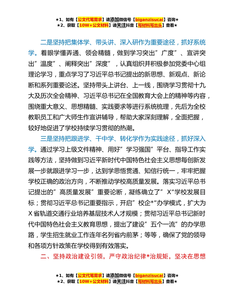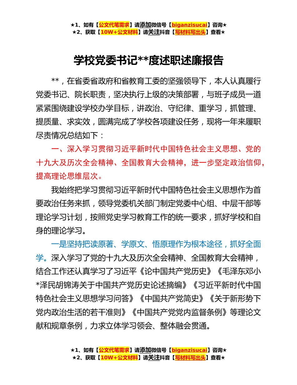 ★1、如有【公文代笔需求】请添加微信号【biganzisucai】咨询★★2、获取【10W+公文材料】请关注抖音【写材料写出头】查看★学校党委书记**度述职述廉报告**,在省委省政府和省教育工委的坚强领导下,本人认真履行党委书记、院长职责,坚决执行上级的决策部署,与班子成员一道紧紧围绕建设学校办学目标,讲政治、守纪律、重学习,抓管理、提质量、求实效,圆满完成了学校各项建设任务,现将一年来履职尽责情况总结如下:一、深入学习贯彻习近平新时代中国特色社会主义思想、党的十九大及历次全会精神、全国教育大会精神,进一步坚定政治信仰,提高理论思维层次。我始终把学习贯彻习近平新时代中国特色社会主义思想作为首要政治任务来抓,领导党委机关部门制定党委中心组、中层干部等理论学习计划,按照党史学习教...