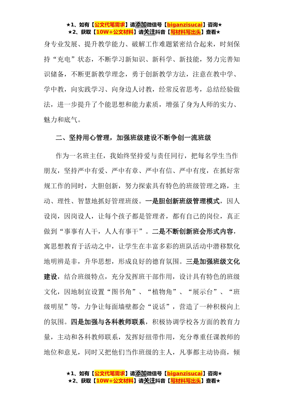 ★1、如有【公文代笔需求】请添加微信号【biganzisucai】咨询★★2、获取【10W+公文材料】请关注抖音【写材料写出头】查看★岁月不居,时节入流,一年的教学工作在忙碌充实的氛围中圆满结束。本年度,我继续担任X年级的语文教学工作、班主任工作,一年来,在校党委和年级党支部的坚强领导下,在各级领导的关怀指导和各位带班教师的大力支持下,我始终按照学校各项教学工作的要求,从各方面严格要求自己,结合本班学生的实际情况,勤勤恳恳,兢兢业业,有计划,有组织,有步骤地开展完成了班级年度的教学工作。回顾一年的工作,有欣喜有遗憾。欣喜的是在这匆忙的岁月流逝中,不仅留下了我们忙碌的身影,也留下了我们辛勤耕耘的足迹,更留下了班级每个孩子点点滴滴的成长和进步;遗憾的是一年的时间有限,个人的精力...
