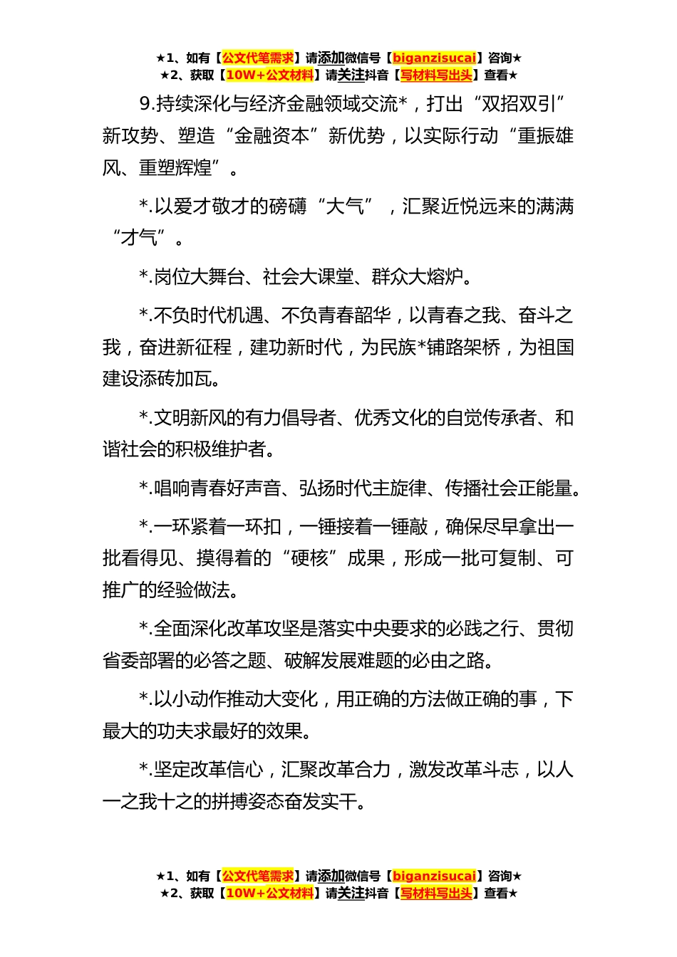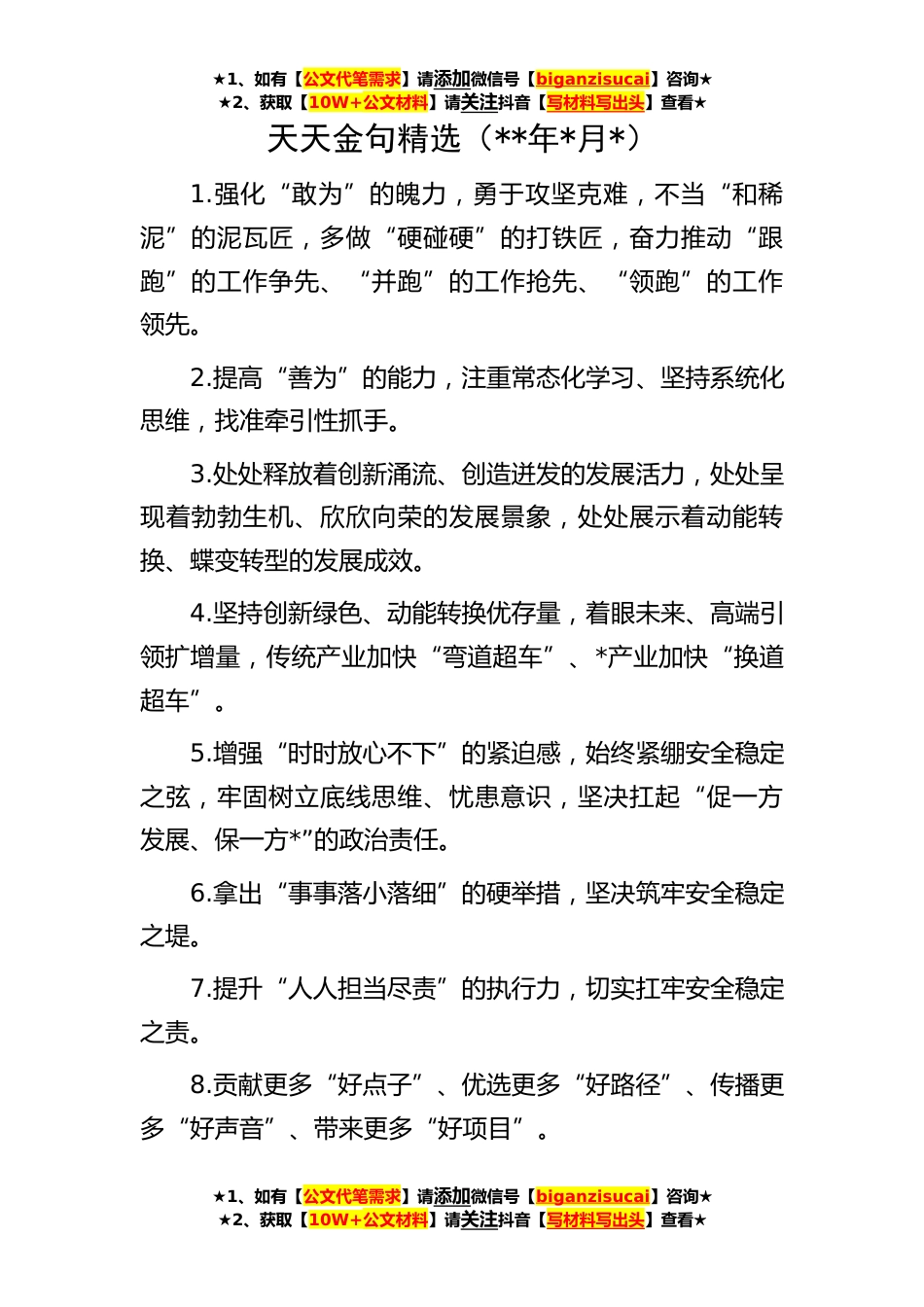 ★1、如有【公文代笔需求】请添加微信号【biganzisucai】咨询★★2、获取【10W+公文材料】请关注抖音【写材料写出头】查看★天天金句精选(**年*月*)1.强化“敢为”的魄力,勇于攻坚克难,不当“和稀泥”的泥瓦匠,多做“硬碰硬”的打铁匠,奋力推动“跟跑”的工作争先、“并跑”的工作抢先、“领跑”的工作领先。2.提高“善为”的能力,注重常态化学习、坚持系统化思维,找准牵引性抓手。3.处处释放着创新涌流、创造迸发的发展活力,处处呈现着勃勃生机、欣欣向荣的发展景象,处处展示着动能转换、蝶变转型的发展成效。4.坚持创新绿色、动能转换优存量,着眼未来、高端引领扩增量,传统产业加快“弯道超车”、*产业加快“换道超车”。5.增强“时时放心不下”的紧迫感,始终紧绷安全稳定之弦,牢固树立底线思维、...