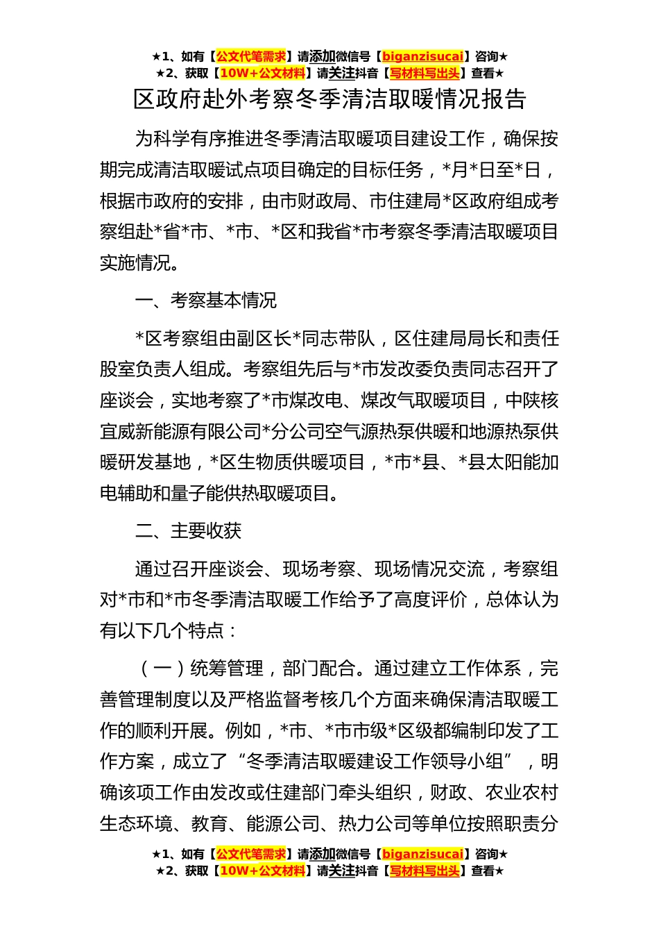 ★1、如有【公文代笔需求】请添加微信号【biganzisucai】咨询★★2、获取【10W+公文材料】请关注抖音【写材料写出头】查看★区政府赴外考察冬季清洁取暖情况报告为科学有序推进冬季清洁取暖项目建设工作,确保按期完成清洁取暖试点项目确定的目标任务,*月*日至*日,根据市政府的安排,由市财政局、市住建局*区政府组成考察组赴*省*市、*市、*区和我省*市考察冬季清洁取暖项目实施情况。一、考察基本情况*区考察组由副区长*同志带队,区住建局局长和责任股室负责人组成。考察组先后与*市发改委负责同志召开了座谈会,实地考察了*市煤改电、煤改气取暖项目,中陕核宜威新能源有限公司*分公司空气源热泵供暖和地源热泵供暖研发基地,*区生物质供暖项目,*市*县、*县太阳能加电辅助和量子能供热取暖项目。二、主要收...