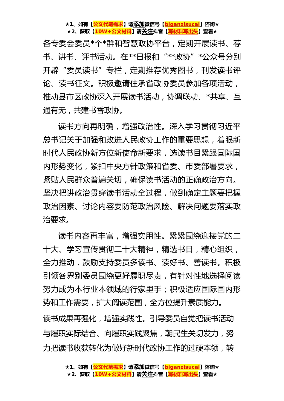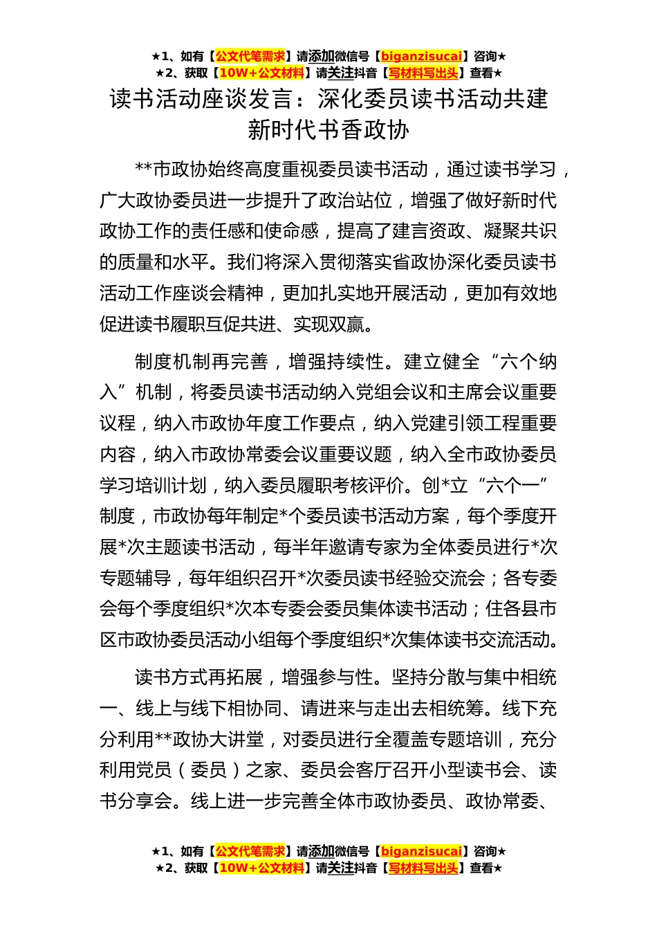 ★1、如有【公文代笔需求】请添加微信号【biganzisucai】咨询★★2、获取【10W+公文材料】请关注抖音【写材料写出头】查看★读书活动座谈发言:深化委员读书活动共建新时代书香政协**市政协始终高度重视委员读书活动,通过读书学习,广大政协委员进一步提升了政治站位,增强了做好新时代政协工作的责任感和使命感,提高了建言资政、凝聚共识的质量和水平。我们将深入贯彻落实省政协深化委员读书活动工作座谈会精神,更加扎实地开展活动,更加有效地促进读书履职互促共进、实现双赢。制度机制再完善,增强持续性。建立健全“六个纳入”机制,将委员读书活动纳入党组会议和主席会议重要议程,纳入市政协年度工作要点,纳入党建引领工程重要内容,纳入市政协常委会议重要议题,纳入全市政协委员学习培训计划,纳入委...