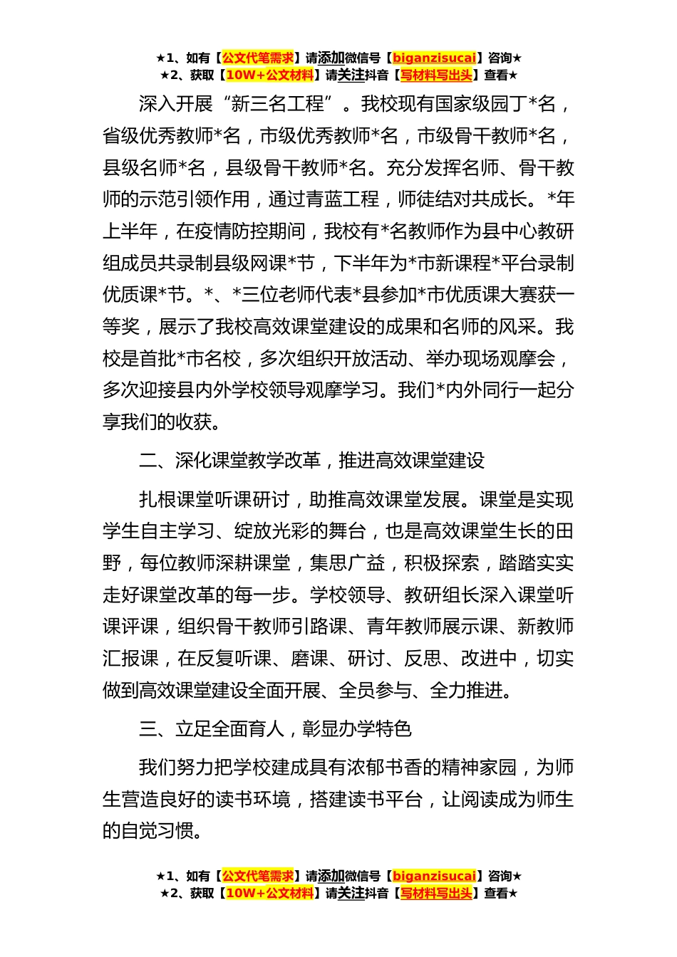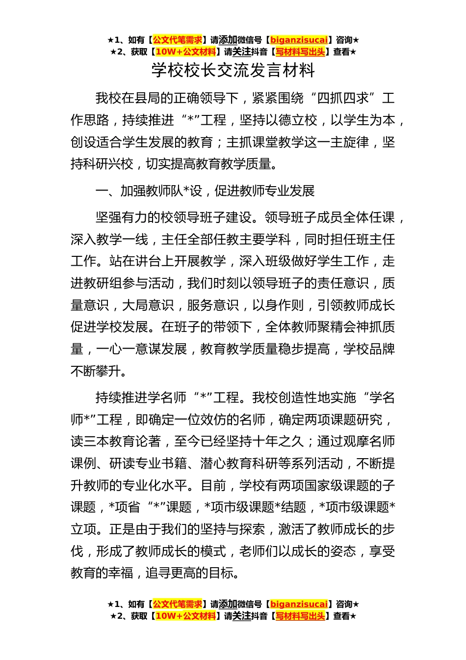 ★1、如有【公文代笔需求】请添加微信号【biganzisucai】咨询★★2、获取【10W+公文材料】请关注抖音【写材料写出头】查看★学校校长交流发言材料我校在县局的正确领导下,紧紧围绕“四抓四求”工作思路,持续推进“*”工程,坚持以德立校,以学生为本,创设适合学生发展的教育;主抓课堂教学这一主旋律,坚持科研兴校,切实提高教育教学质量。一、加强教师队*设,促进教师专业发展坚强有力的校领导班子建设。领导班子成员全体任课,深入教学一线,主任全部任教主要学科,同时担任班主任工作。站在讲台上开展教学,深入班级做好学生工作,走进教研组参与活动,我们时刻以领导班子的责任意识,质量意识,大局意识,服务意识,以身作则,引领教师成长促进学校发展。在班子的带领下,全体教师聚精会神抓质量,一心一...
