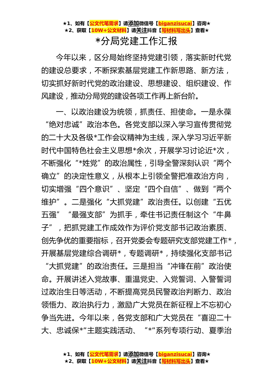★1、如有【公文代笔需求】请添加微信号【biganzisucai】咨询★★2、获取【10W+公文材料】请关注抖音【写材料写出头】查看★★1、如有【公文代笔需求】请添加微信号【biganzisucai】咨询★★2、获取【10W+公文材料】请关注抖音【写材料写出头】查看★★1、如有【公文代笔需求】请添加微信号【biganzisucai】咨询★★2、获取【10W+公文材料】请关注抖音【写材料写出头】查看★*分局党建工作汇报今年以来,区分局始终坚持党建引领,落实新时代党的建设总要求,不断探索基层党建工作新思路、新方法,切实抓好新时代党的政治建设、思想建设、组织建设、作风建设,推动分局党的建设各项工作再上新台阶。一、以政治建设为统领,抓责任、担使命。一是永葆“绝对忠诚”政治本色。各党支部以深入学习宣传贯彻党的二十大及各...