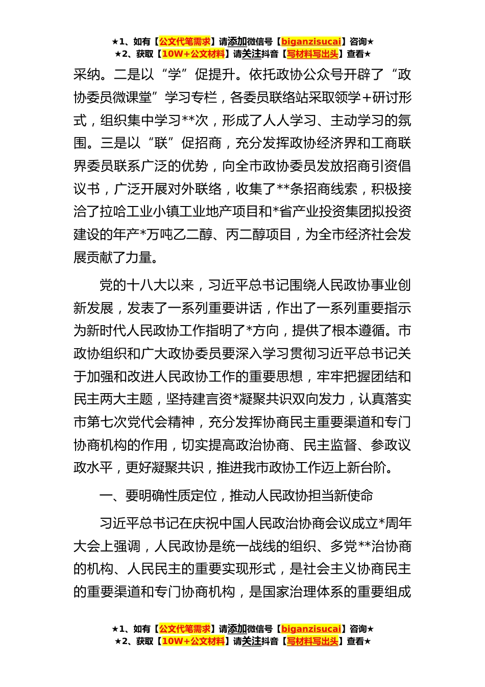 ★1、如有【公文代笔需求】请添加微信号【biganzisucai】咨询★★2、获取【10W+公文材料】请关注抖音【写材料写出头】查看★在**年市政协八届三次常委会议上的讲话各位委员,同志们:很高兴参加市政协八届三次常委会会议,就进一步加强和改进新时代政协工作,深入落实市第七次党代会精神与大家交流,并且就优化营商环境听取意见建议。刚才,**同志作了题为《关于我市优化营商环境促进经济发展》的调研报告,深入分析了我市优化营商环境的现状及成效,指出了当前存在的问题,并从提高服务质效构建长效机制、加强社会信用体系和法治建设、共建共治共享等*方面提出很好的意见建议。**、**、**、**、***同志也分别从不同方面作了很好的发言,**同志就相关工作情况作了介绍,通过认真听取发言和详细翻阅材料,总体感受...