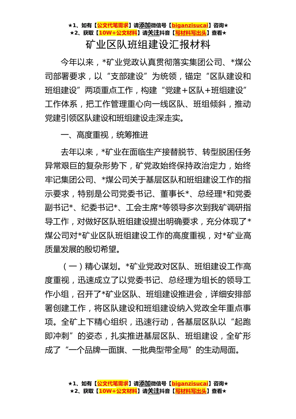 ★1、如有【公文代笔需求】请添加微信号【biganzisucai】咨询★★2、获取【10W+公文材料】请关注抖音【写材料写出头】查看★矿业区队班组建设汇报材料今年以来,*矿业党政认真贯彻落实集团公司、*煤公司部署要求,以“支部建设”为统领,锚定“区队建设和班组建设”两项重点工作,构建“党建+区队+班组建设”工作体系,把工作管理重心向一线区队、班组倾斜,推动党建引领区队建设和班组建设走深走实。一、高度重视,统筹推进去年以来,*矿业在面临生产接替脱节、转型脱困任务异常艰巨的复杂形势下,矿党政始终保持政治定力,始终牢记集团公司、*煤公司关于基层区队和班组建设工作的指示要求,特别是公司党委书记、董事长*、总经理*和党委副书记*、纪委书记*、工会主席*等领导多次到我矿调研指导工作,对做好区队班...