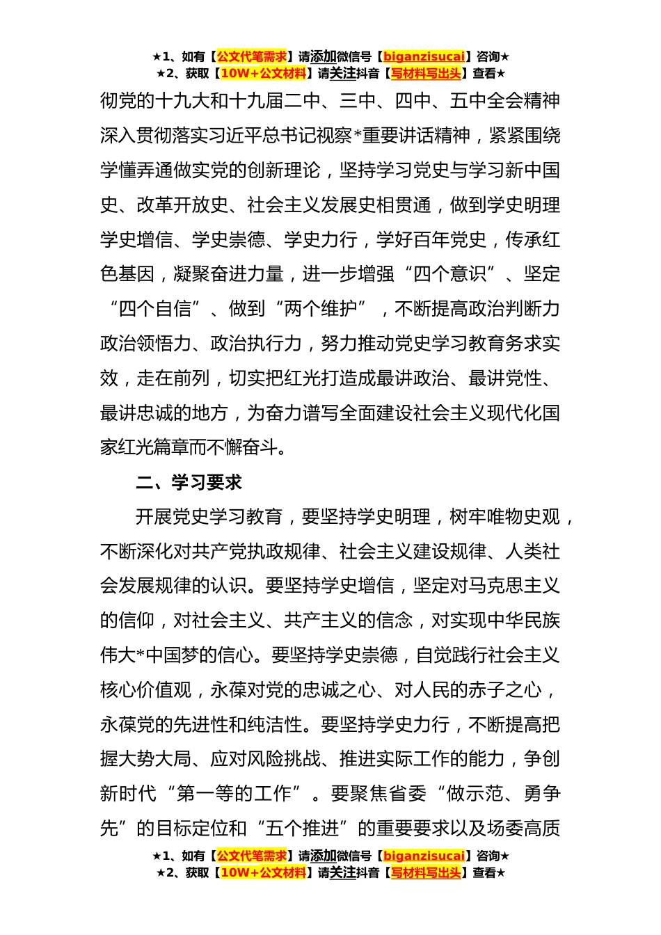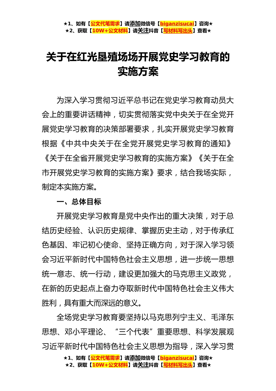 ★1、如有【公文代笔需求】请添加微信号【biganzisucai】咨询★★2、获取【10W+公文材料】请关注抖音【写材料写出头】查看★关于在红光垦殖场场开展党史学习教育的实施方案为深入学习贯彻习近平总书记在党史学习教育动员大会上的重要讲话精神,切实贯彻落实党中央关于在全党开展党史学习教育的决策部署要求,扎实开展党史学习教育根据《中共中央关于在全党开展党史学习教育的通知》《关于在全省开展党史学习教育的实施方案》《关于在全市开展党史学习教育的实施方案》要求,结合我场实际,制定本实施方案。一、总体目标开展党史学习教育是党中央作出的重大决策,对于总结历史经验、认识历史规律、掌握历史主动,对于传承红色基因、牢记初心使命、坚持正确方向,对于深入学习领会习近平新时代中国特色社会主义思想...