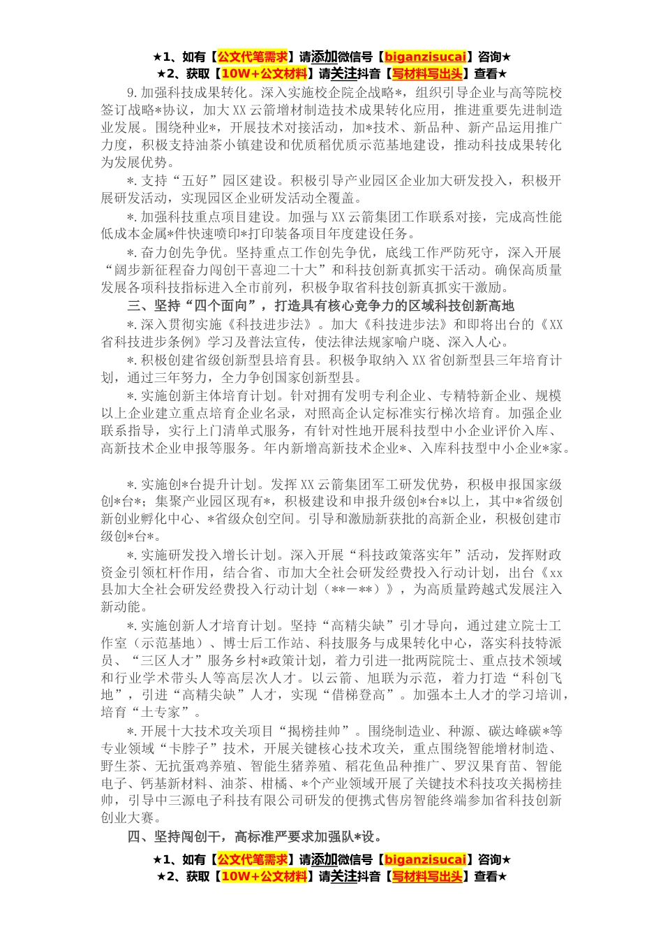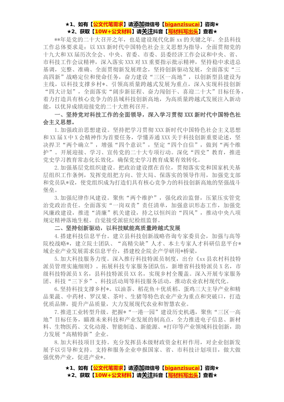 ★1、如有【公文代笔需求】请添加微信号【biganzisucai】咨询★★2、获取【10W+公文材料】请关注抖音【写材料写出头】查看★**年是党的二十大召开之年,也是建设现代化新xx的关键之年。全县科技工作总体要求是:以XXX新时代中国特色社会主义思想为指导,全面贯彻党的十九大和XX届历次全会、中央、省委、市委、县委经济工作会议和中央、省、市科技工作会议精神,深入落实XXX对XX重要指示批示精神,坚持稳中求进总基调,完整、准确、全面贯彻新发展理念,坚持创新驱动发展,全面落实“三高四新”战略定位和使命任务,奋力建设“三区一高地”,以创新型县建设为主线,以科技支撑乡村*、引领高质量跨越式发展为重点,深入实现科技创新“四大计划”,全面落实“阔步新征程、奋力闯创干、喜迎二十大”目标任务,着力打造...