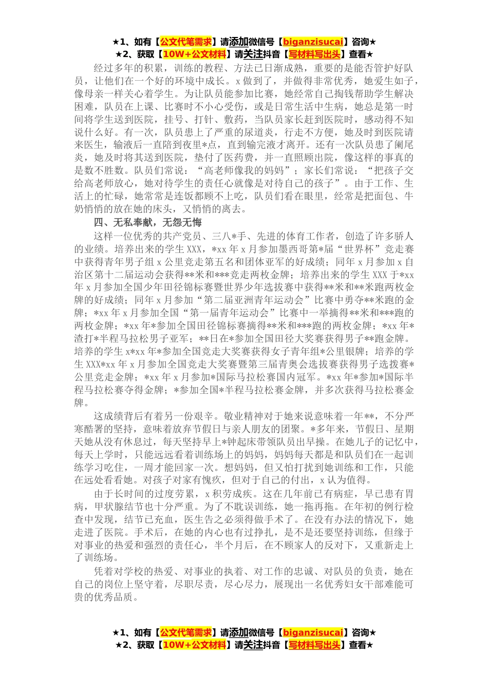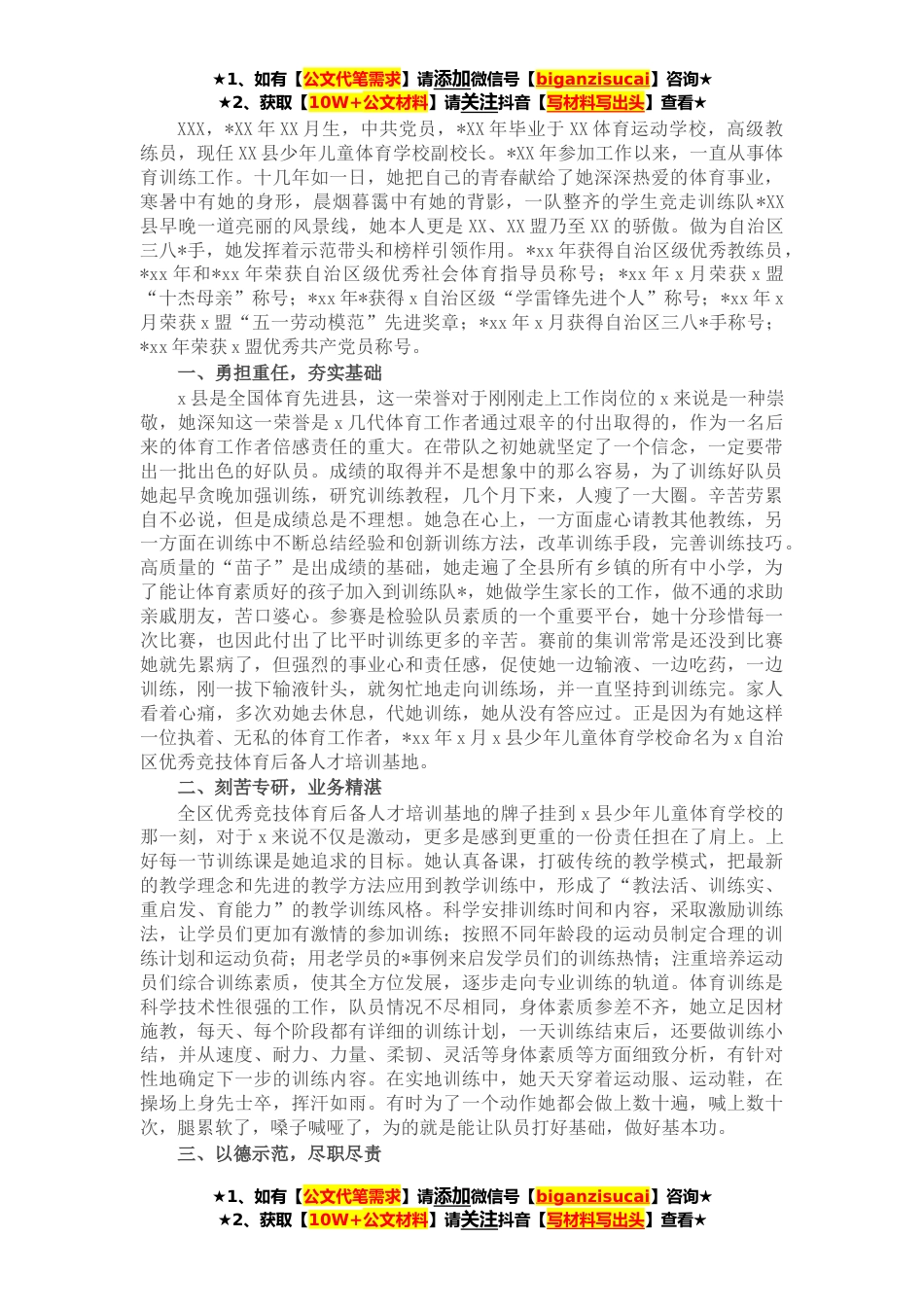 ★1、如有【公文代笔需求】请添加微信号【biganzisucai】咨询★★2、获取【10W+公文材料】请关注抖音【写材料写出头】查看★XXX,*XX年XX月生,中共党员,*XX年毕业于XX体育运动学校,高级教练员,现任XX县少年儿童体育学校副校长。*XX年参加工作以来,一直从事体育训练工作。十几年如一日,她把自己的青春献给了她深深热爱的体育事业,寒暑中有她的身形,晨烟暮霭中有她的背影,一队整齐的学生竞走训练队*XX县早晚一道亮丽的风景线,她本人更是XX、XX盟乃至XX的骄傲。做为自治区三八*手,她发挥着示范带头和榜样引领作用。*xx年获得自治区级优秀教练员,*xx年和*xx年荣获自治区级优秀社会体育指导员称号;*xx年x月荣获x盟“十杰母亲”称号;*xx年*获得x自治区级“学雷锋先进个人”称号;*xx年x月荣获x盟“五一劳...