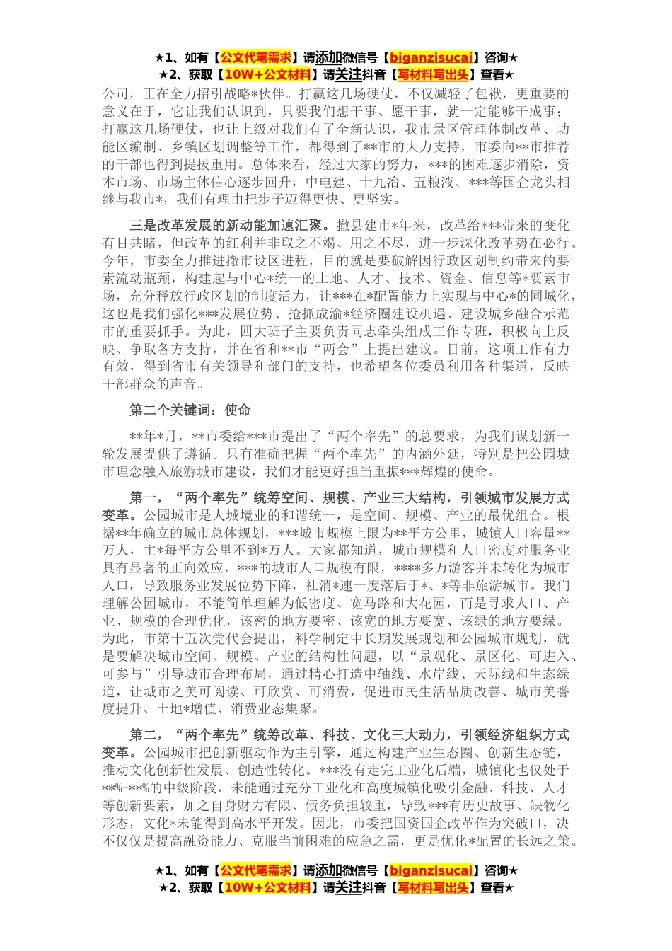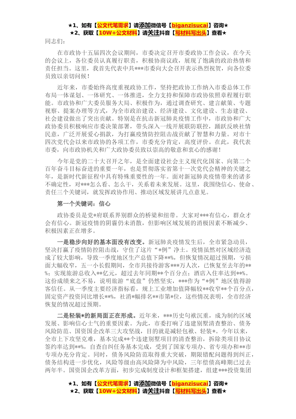 ★1、如有【公文代笔需求】请添加微信号【biganzisucai】咨询★★2、获取【10W+公文材料】请关注抖音【写材料写出头】查看★同志们:在市政协十五届四次会议期间,市委决定召开市委政协工作会议,在今天的会议上,各位委员认真履行职责,积极协商议政,展现了饱满的政治热情和责任担当。这里,我首先代表中共***市委向大会召开表示热烈祝贺,向各位委员致以亲切问候!近年来,市委始终高度重视政协工作,坚持把政协工作纳入市委总体工作布局一体谋划、一体研究、一体推进,全力支持和保障市政协依照章程履行职能。市政协和广大委员服务大局、积极作为,通过调查研究、建言献策、专题视察、提案办理等方式,为全市政治建设、经济建设、文化建设、生态建设、社会建设做出了突出贡献。特别是在抗击新冠肺炎疫情工作中...
