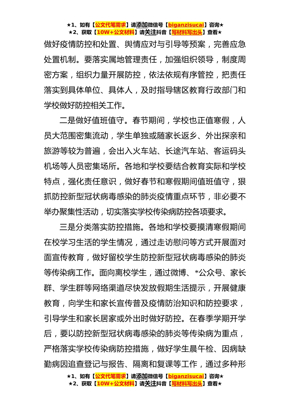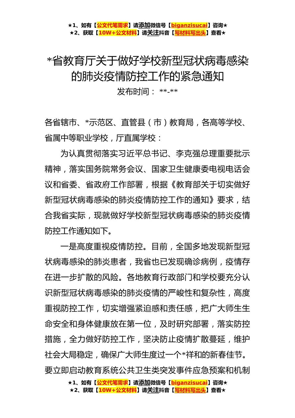 ★1、如有【公文代笔需求】请添加微信号【biganzisucai】咨询★★2、获取【10W+公文材料】请关注抖音【写材料写出头】查看★*省教育厅关于做好学校新型冠状病毒感染的肺炎疫情防控工作的紧急通知发布时间:**-**各省辖市、*示范区、直管县(市)教育局,各高等学校、省属中等职业学校,厅直属学校:为认真贯彻落实习近平总书记、李克强总理重要批示精神,落实国务院常务会议、国家卫生健康委电视电话会议和省委、省政府工作部署,根据《教育部关于切实做好新型冠状病毒感染的肺炎疫情防控工作的通知》要求,结合我省实际,现就做好学校新型冠状病毒感染的肺炎疫情防控工作通知如下。一是高度重视疫情防控。目前,全国多地发现新型冠状病毒感染的肺炎患者,我省也已发现确诊病例,疫情存在进一步扩散的风险。各地教...