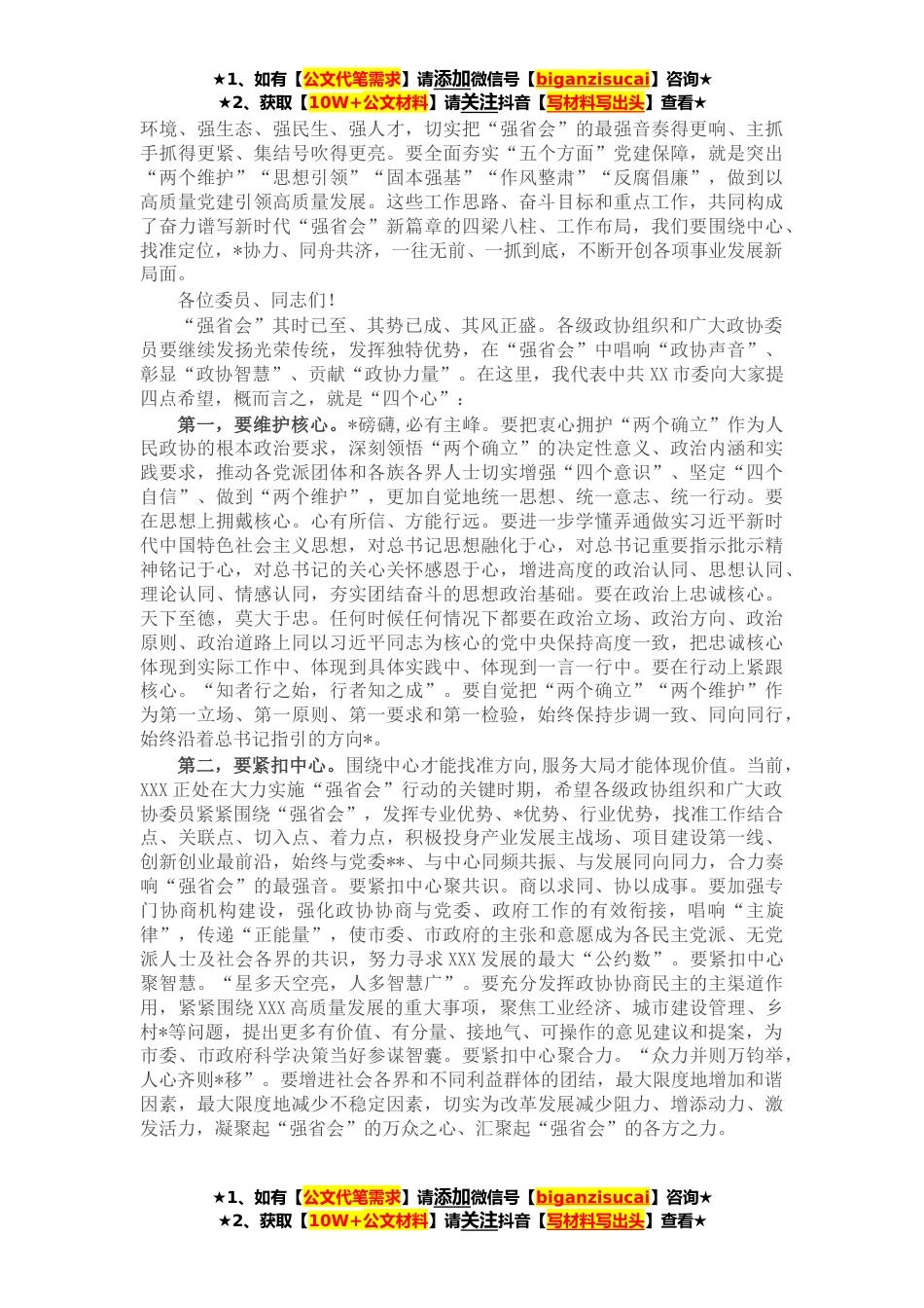 ★1、如有【公文代笔需求】请添加微信号【biganzisucai】咨询★★2、获取【10W+公文材料】请关注抖音【写材料写出头】查看★各位委员、同志们:在这辞旧迎新之际,我们迎来了政协第十三届XX市委员会第一次会议的隆重开幕。在此,我代表中共XX市委,向大会的召开表示热烈的祝贺!向出席大会的政协委员和列席会议的全体同志致以诚挚的问候!时间记录历程,奋斗创造辉煌。五年来,在习近平新时代中国特色社会主义思想的指引下,在省委、省政府的坚强领导下,“知行合一、协力争先”的XX人民在征途中留下足迹,在赶考中书写答卷,在磨砺中收获喜悦,在奋斗中感受幸福,“讲政治”的意识更加坚定,“强实体”的基础更加夯实,“大数据”的名片更加亮丽,“促融合”的格局更加协同,“大生态”的底色更加鲜明,“*生”的成...