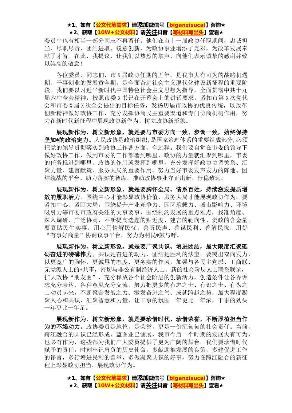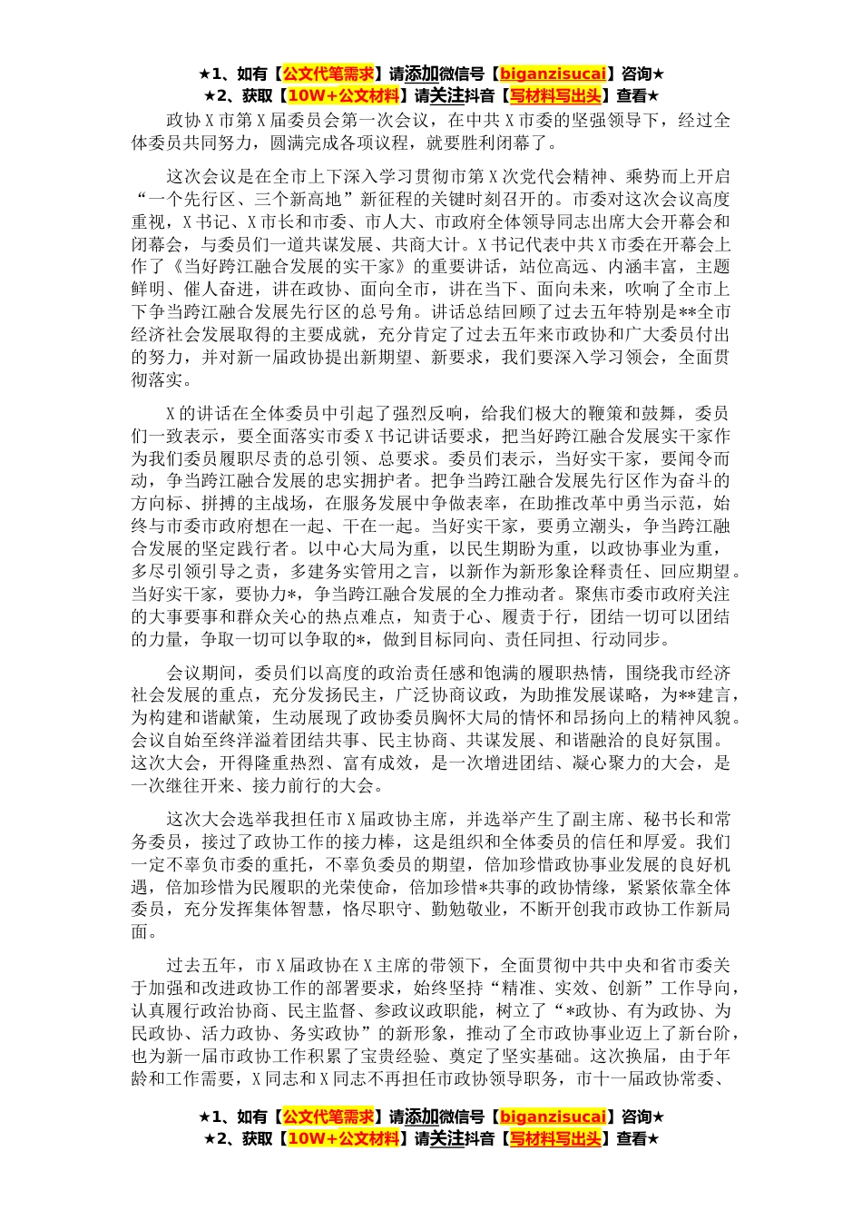 ★1、如有【公文代笔需求】请添加微信号【biganzisucai】咨询★★2、获取【10W+公文材料】请关注抖音【写材料写出头】查看★政协X市第X届委员会第一次会议,在中共X市委的坚强领导下,经过全体委员共同努力,圆满完成各项议程,就要胜利闭幕了。这次会议是在全市上下深入学习贯彻市第X次党代会精神、乘势而上开启“一个先行区、三个新高地”新征程的关键时刻召开的。市委对这次会议高度重视,X书记、X市长和市委、市人大、市政府全体领导同志出席大会开幕会和闭幕会,与委员们一道共谋发展、共商大计。X书记代表中共X市委在开幕会上作了《当好跨江融合发展的实干家》的重要讲话,站位高远、内涵丰富,主题鲜明、催人奋进,讲在政协、面向全市,讲在当下、面向未来,吹响了全市上下争当跨江融合发展先行区的总号角...