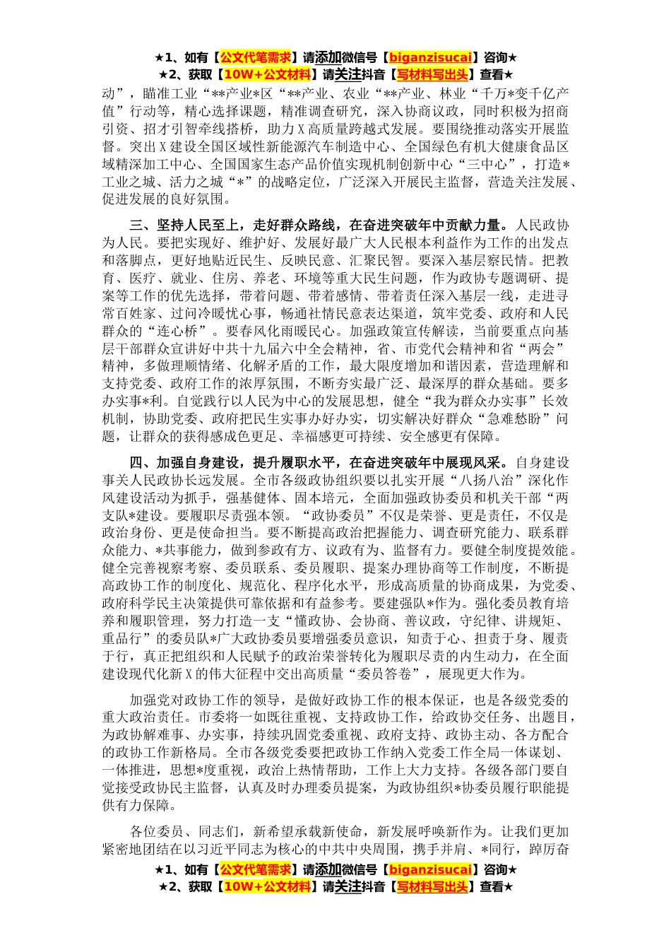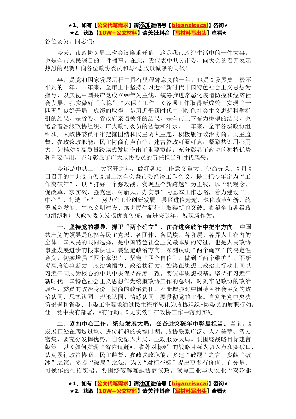 ★1、如有【公文代笔需求】请添加微信号【biganzisucai】咨询★★2、获取【10W+公文材料】请关注抖音【写材料写出头】查看★各位委员、同志们:今天,市政协X届二次会议隆重开幕,这是我市政治生活中的一件大事,也是全市人民瞩目的一件盛事。在此,我代表中共X市委,向大会的召开表示热烈的祝贺!向各位政协委员和与*志致以诚挚的问候!**,是党和国家发展历程中具有里程碑意义的一年,也是X发展史上极不平凡的一年。一年来,全市上下坚持以习近平新时代中国特色社会主义思想为指导,以庆祝中国共产党成立**年为主线,统筹推进常态化疫情防控和经济社会发展,扎实做好“六稳”“六保”工作,X各项工作取得新成效,实现“十四五”良好开局。成绩的取得,是习近平新时代中国特色社会主义思想科学指引的结果,是省委...