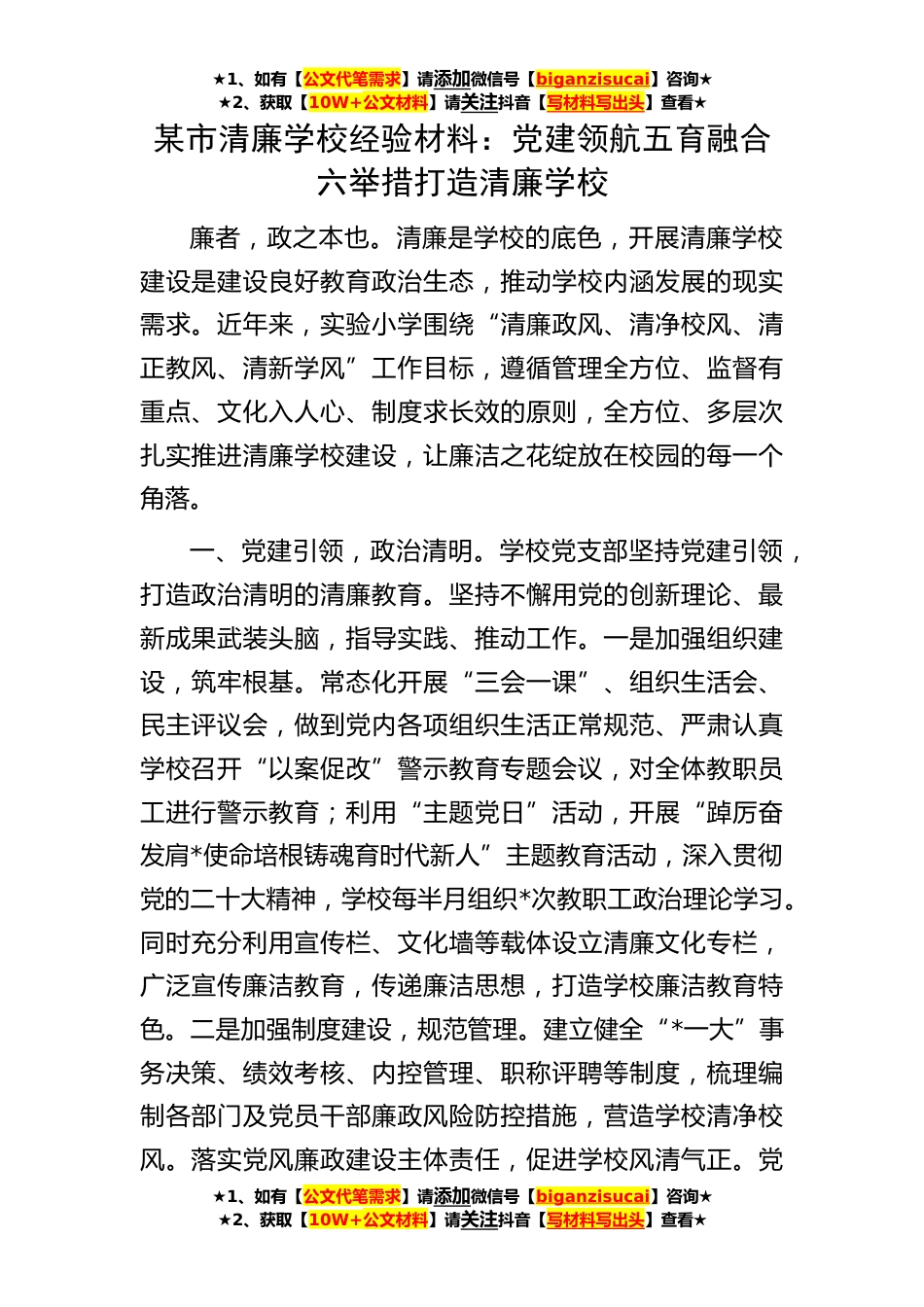 ★1、如有【公文代笔需求】请添加微信号【biganzisucai】咨询★★2、获取【10W+公文材料】请关注抖音【写材料写出头】查看★★1、如有【公文代笔需求】请添加微信号【biganzisucai】咨询★★2、获取【10W+公文材料】请关注抖音【写材料写出头】查看★★1、如有【公文代笔需求】请添加微信号【biganzisucai】咨询★★2、获取【10W+公文材料】请关注抖音【写材料写出头】查看★某市清廉学校经验材料:党建领航五育融合六举措打造清廉学校廉者,政之本也。清廉是学校的底色,开展清廉学校建设是建设良好教育政治生态,推动学校内涵发展的现实需求。近年来,实验小学围绕“清廉政风、清净校风、清正教风、清新学风”工作目标,遵循管理全方位、监督有重点、文化入人心、制度求长效的原则,全方位、多层次扎实推进清廉...