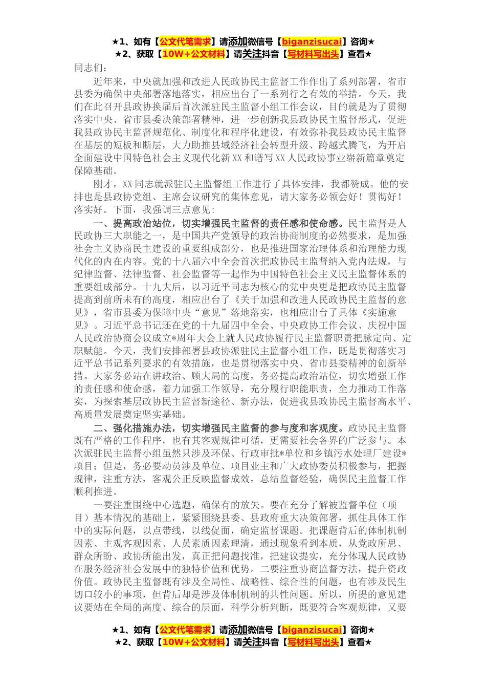 ★1、如有【公文代笔需求】请添加微信号【biganzisucai】咨询★★2、获取【10W+公文材料】请关注抖音【写材料写出头】查看★同志们:近年来,中央就加强和改进人民政协民主监督工作作出了系列部署,省市县委为确保中央部署落地落实,相应出台了一系列行之有效的举措。今天,我们在此召开县政协换届后首次派驻民主监督小组工作会议,目的就是为了贯彻落实中央、省市县委决策部署精神,进一步创新我县政协民主监督形式,促进我县政协民主监督规范化、制度化和程序化建设,有效弥补我县政协民主监督在基层的短板和断层,大力助推县域经济社会转型升级、跨越式腾飞,为开启全面建设中国特色社会主义现代化新XX和谱写XX人民政协事业崭新篇章奠定保障基础。刚才,XX同志就派驻民主监督组工作进行了具体安排,我都赞成。...