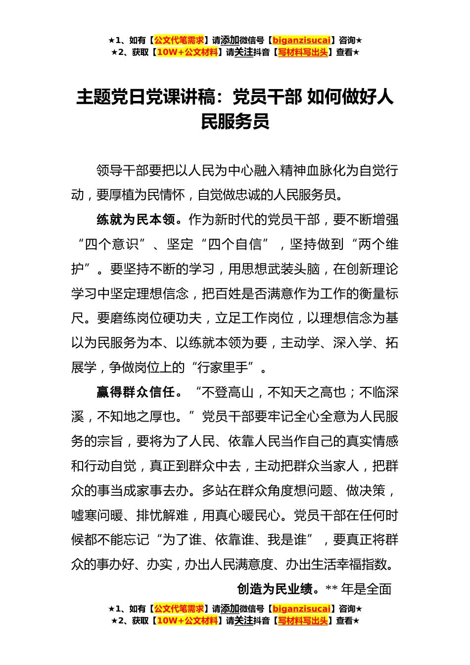 ★1、如有【公文代笔需求】请添加微信号【biganzisucai】咨询★★2、获取【10W+公文材料】请关注抖音【写材料写出头】查看★主题党日党课讲稿:党员干部如何做好人民服务员领导干部要把以人民为中心融入精神血脉化为自觉行动,要厚植为民情怀,自觉做忠诚的人民服务员。练就为民本领。作为新时代的党员干部,要不断增强“四个意识”、坚定“四个自信”,坚持做到“两个维护”。要坚持不断的学习,用思想武装头脑,在创新理论学习中坚定理想信念,把百姓是否满意作为工作的衡量标尺。要磨练岗位硬功夫,立足工作岗位,以理想信念为基以为民服务为本、以练就本领为要,主动学、深入学、拓展学,争做岗位上的“行家里手”。赢得群众信任。“不登高山,不知天之高也;不临深溪,不知地之厚也。”党员干部要牢记全心全...