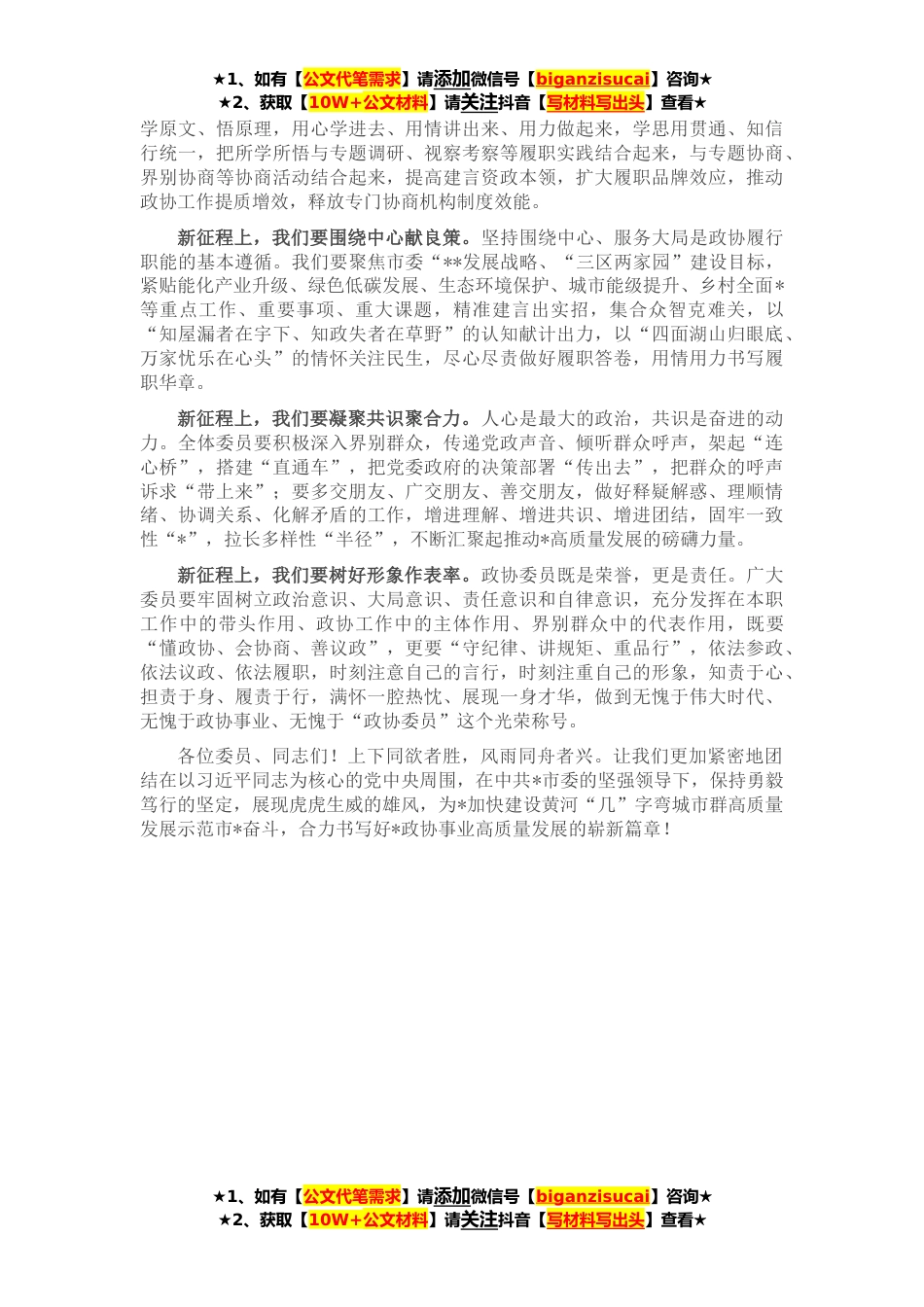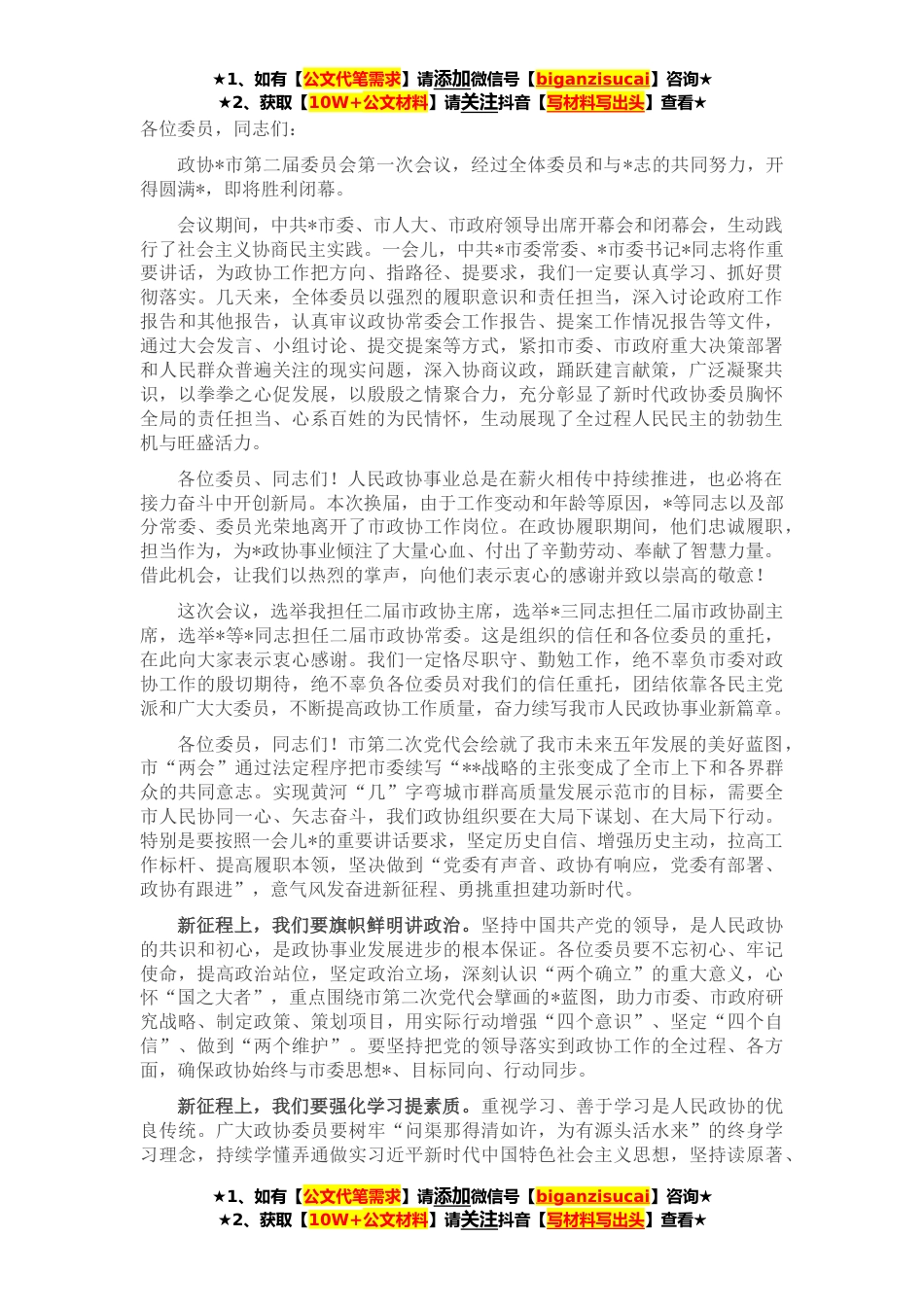 ★1、如有【公文代笔需求】请添加微信号【biganzisucai】咨询★★2、获取【10W+公文材料】请关注抖音【写材料写出头】查看★各位委员,同志们:政协*市第二届委员会第一次会议,经过全体委员和与*志的共同努力,开得圆满*,即将胜利闭幕。会议期间,中共*市委、市人大、市政府领导出席开幕会和闭幕会,生动践行了社会主义协商民主实践。一会儿,中共*市委常委、*市委书记*同志将作重要讲话,为政协工作把方向、指路径、提要求,我们一定要认真学习、抓好贯彻落实。几天来,全体委员以强烈的履职意识和责任担当,深入讨论政府工作报告和其他报告,认真审议政协常委会工作报告、提案工作情况报告等文件,通过大会发言、小组讨论、提交提案等方式,紧扣市委、市政府重大决策部署和人民群众普遍关注的现实问题,深入协...