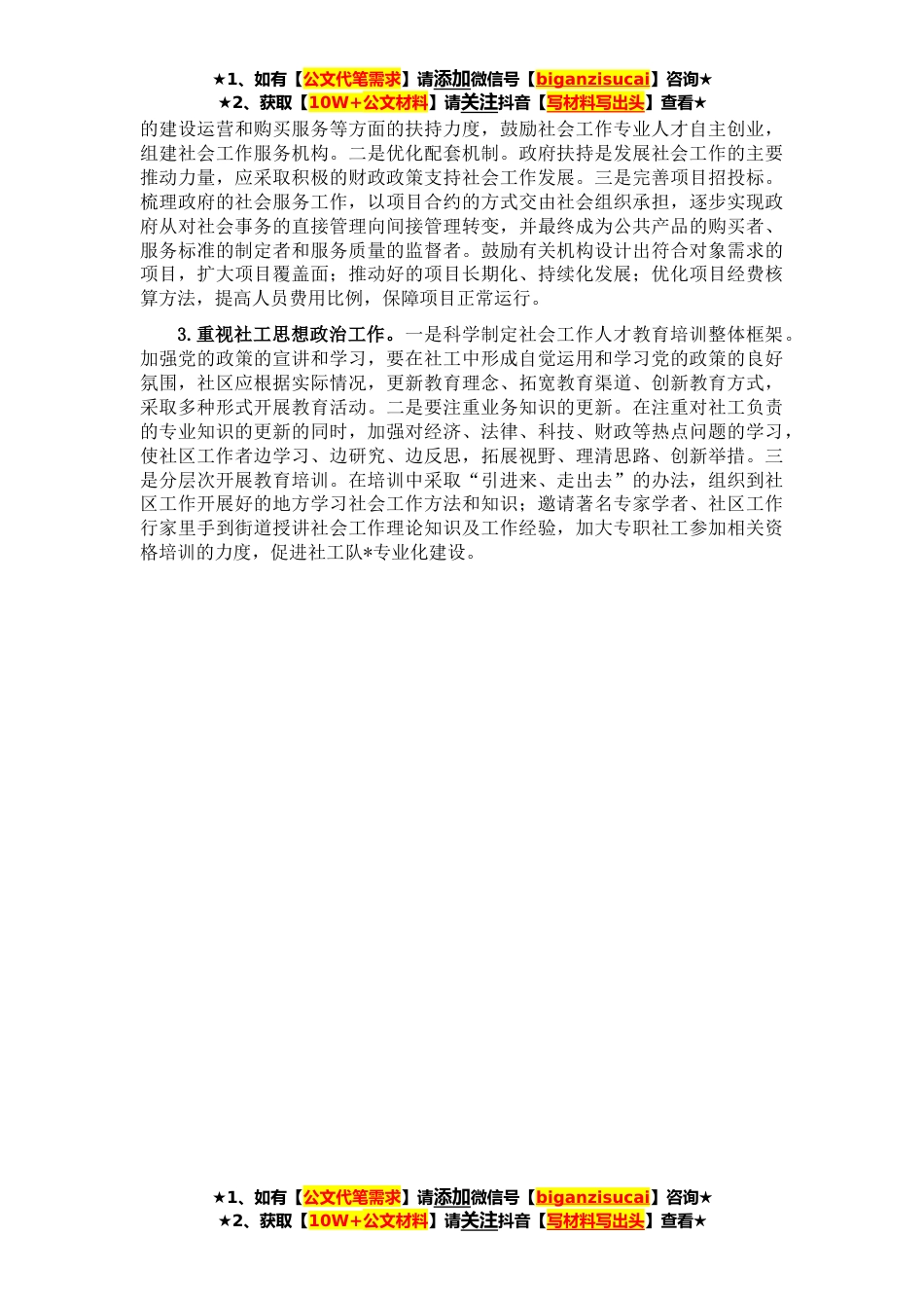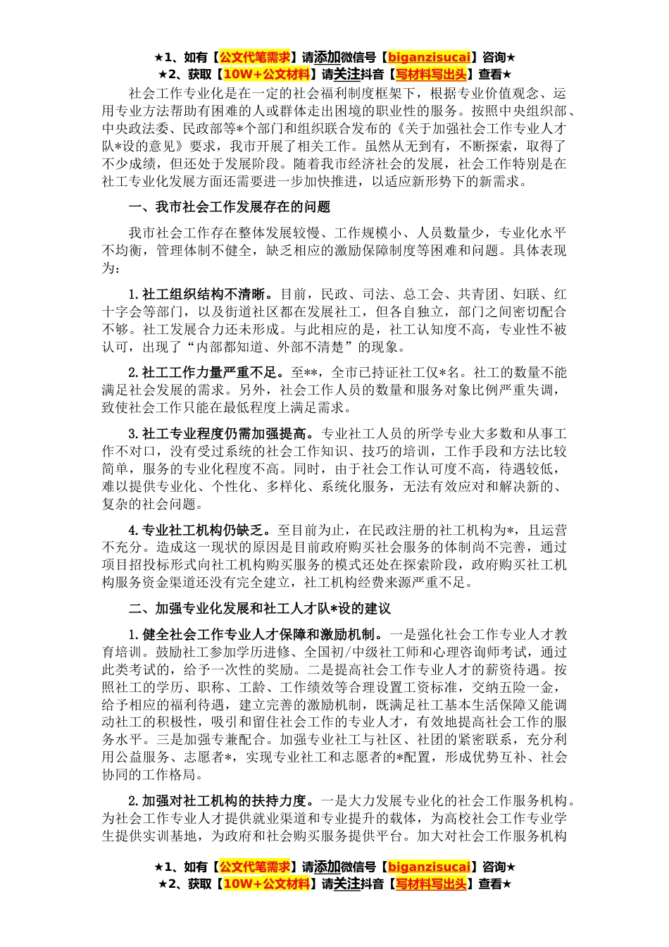 ★1、如有【公文代笔需求】请添加微信号【biganzisucai】咨询★★2、获取【10W+公文材料】请关注抖音【写材料写出头】查看★社会工作专业化是在一定的社会福利制度框架下,根据专业价值观念、运用专业方法帮助有困难的人或群体走出困境的职业性的服务。按照中央组织部、中央政法委、民政部等*个部门和组织联合发布的《关于加强社会工作专业人才队*设的意见》要求,我市开展了相关工作。虽然从无到有,不断探索,取得了不少成绩,但还处于发展阶段。随着我市经济社会的发展,社会工作特别是在社工专业化发展方面还需要进一步加快推进,以适应新形势下的新需求。一、我市社会工作发展存在的问题我市社会工作存在整体发展较慢、工作规模小、人员数量少,专业化水平不均衡,管理体制不健全,缺乏相应的激励保障制度等...