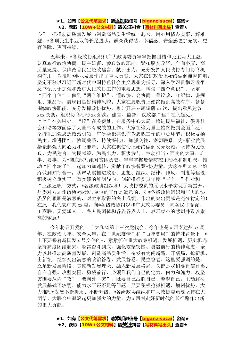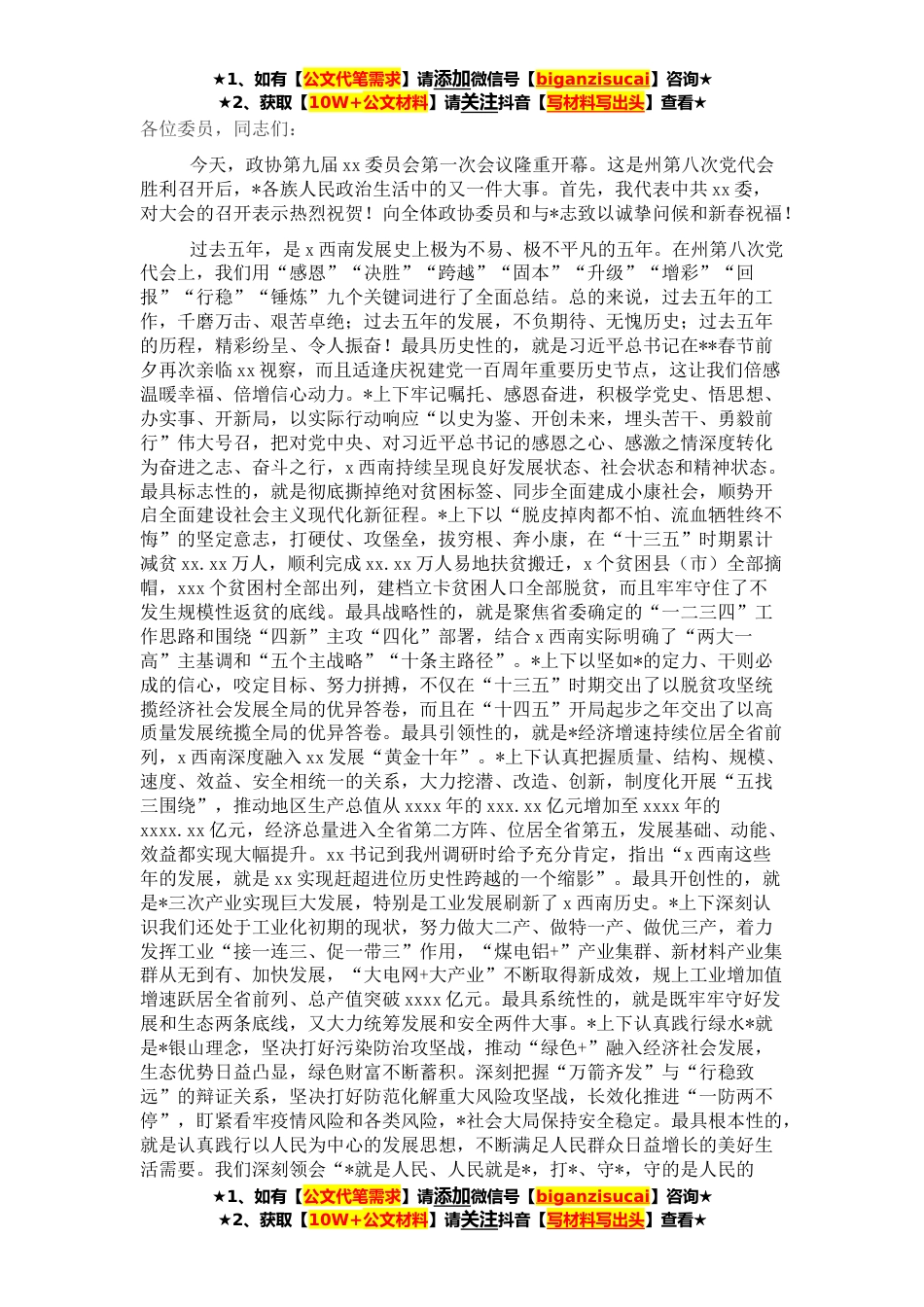 ★1、如有【公文代笔需求】请添加微信号【biganzisucai】咨询★★2、获取【10W+公文材料】请关注抖音【写材料写出头】查看★各位委员,同志们:今天,政协第九届xx委员会第一次会议隆重开幕。这是州第八次党代会胜利召开后,*各族人民政治生活中的又一件大事。首先,我代表中共xx委,对大会的召开表示热烈祝贺!向全体政协委员和与*志致以诚挚问候和新春祝福!过去五年,是x西南发展史上极为不易、极不平凡的五年。在州第八次党代会上,我们用“感恩”“决胜”“跨越”“固本”“升级”“增彩”“回报”“行稳”“锤炼”九个关键词进行了全面总结。总的来说,过去五年的工作,千磨万击、艰苦卓绝;过去五年的发展,不负期待、无愧历史;过去五年的历程,精彩纷呈、令人振奋!最具历史性的,就是习近平总书记在**春...