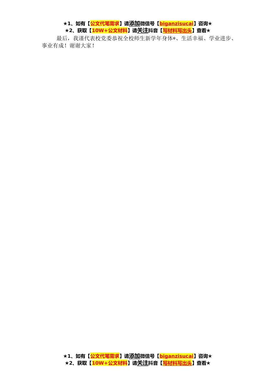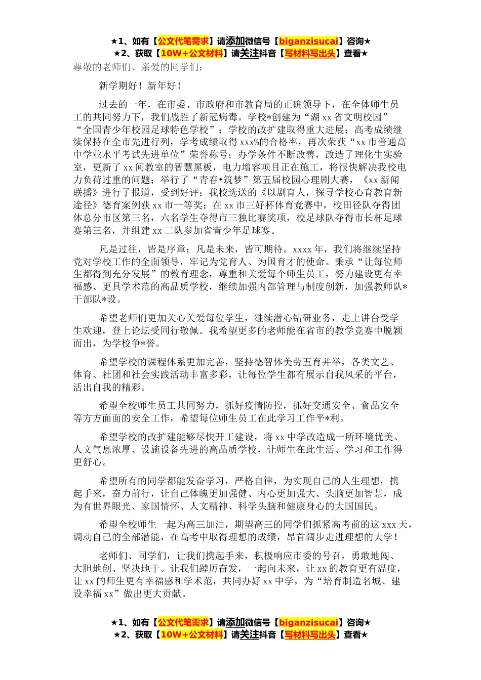 ★1、如有【公文代笔需求】请添加微信号【biganzisucai】咨询★★2、获取【10W+公文材料】请关注抖音【写材料写出头】查看★尊敬的老师们、亲爱的同学们:新学期好!新年好!过去的一年,在市委、市政府和市教育局的正确领导下,在全体师生员工的共同努力下,我们战胜了新冠病毒。学校*创建为“湖xx省文明校园”“全国青少年校园足球特色学校”;学校的改扩建取得重大进展;高考成绩继续保持在全市先进行列,学考成绩取得xxx%的合格率,再次荣获“xx市普通高中学业水平考试先进单位”荣誉称号;办学条件不断改善,改造了理化生实验室,更新了xx间教室的智慧黑板,电力增容项目正在施工,将很快解决我校电力负荷过重的问题;举行了“青春•筑梦”第五届校园心理剧大赛,《xx新闻联播》进行了报道,受到好评;我校选...